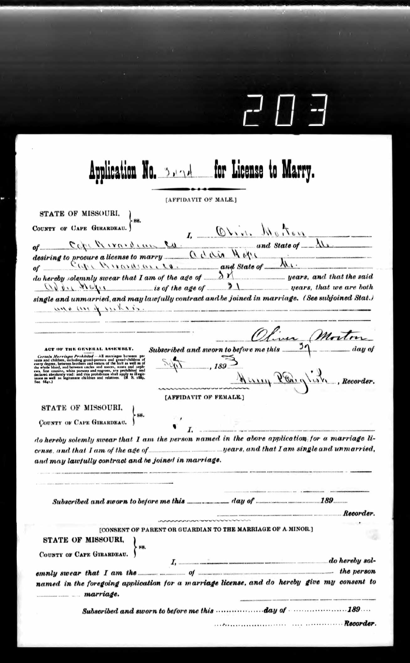 Missouri Marriage Application, Oliver Morton and Addie Hope