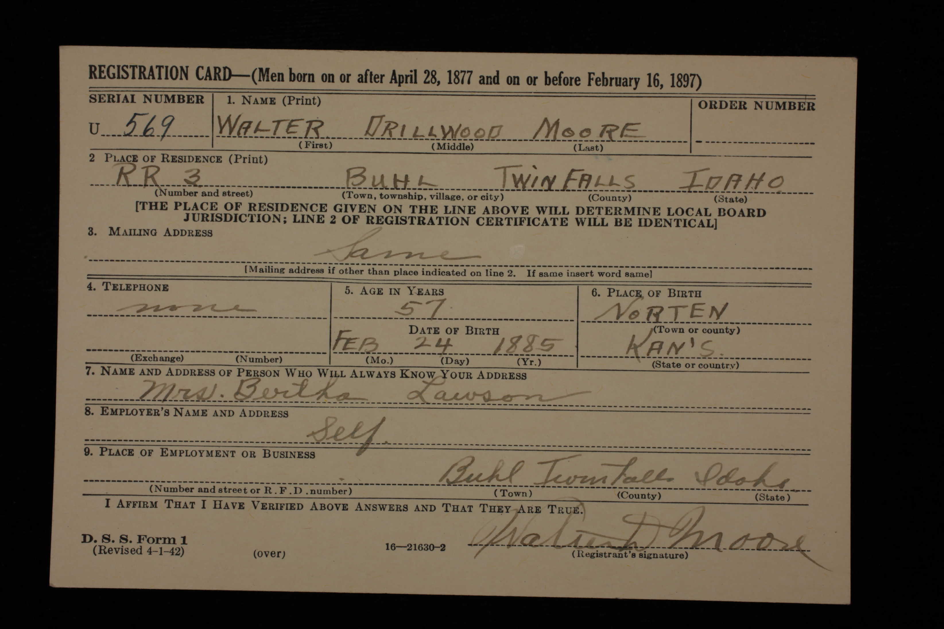 WWII Draft Registration, Walter Drillwood Moore