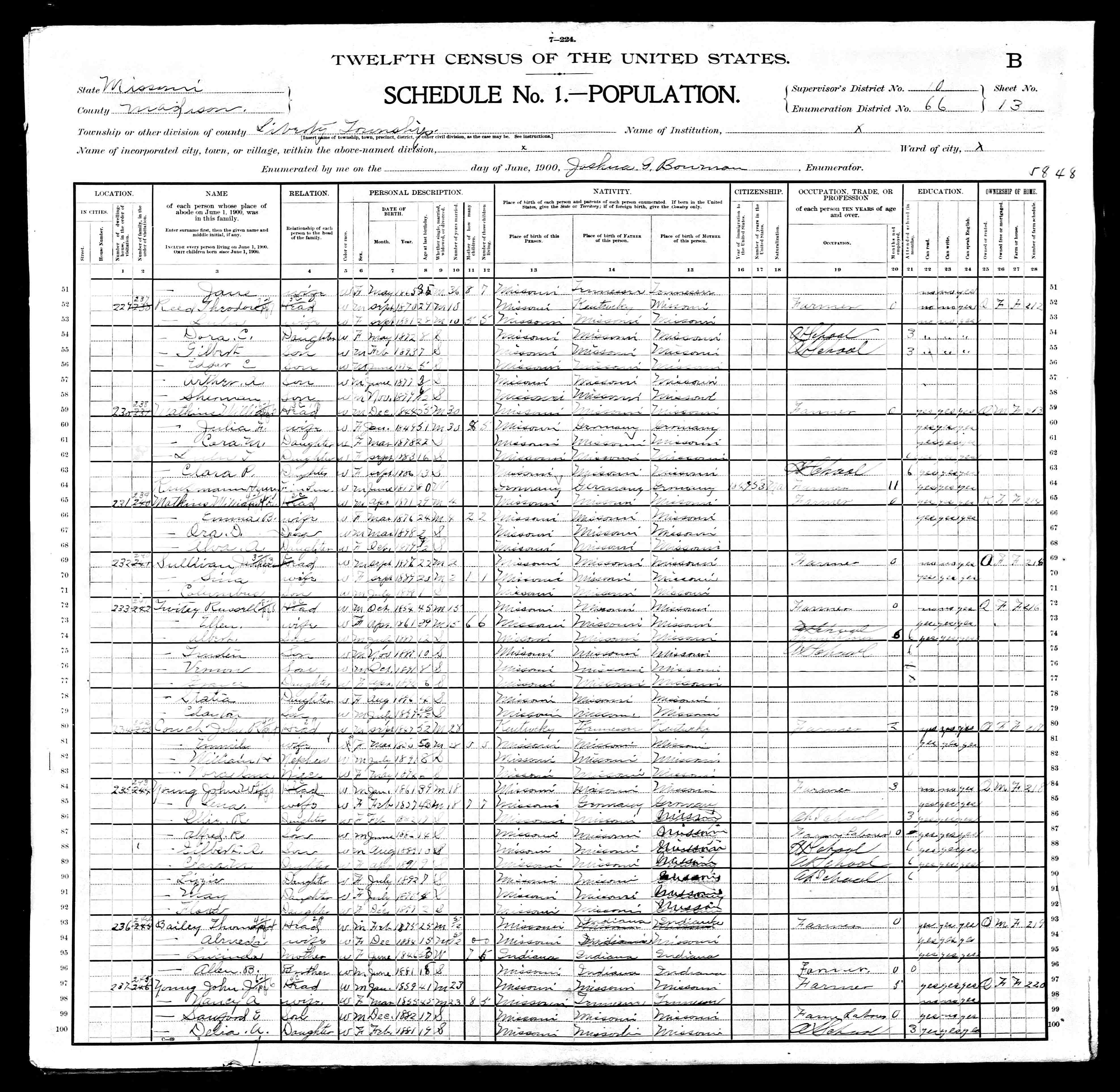 Missouri, Supervisor's District 10, Enumeration District 66, Sheet 13B, Lines 52-58