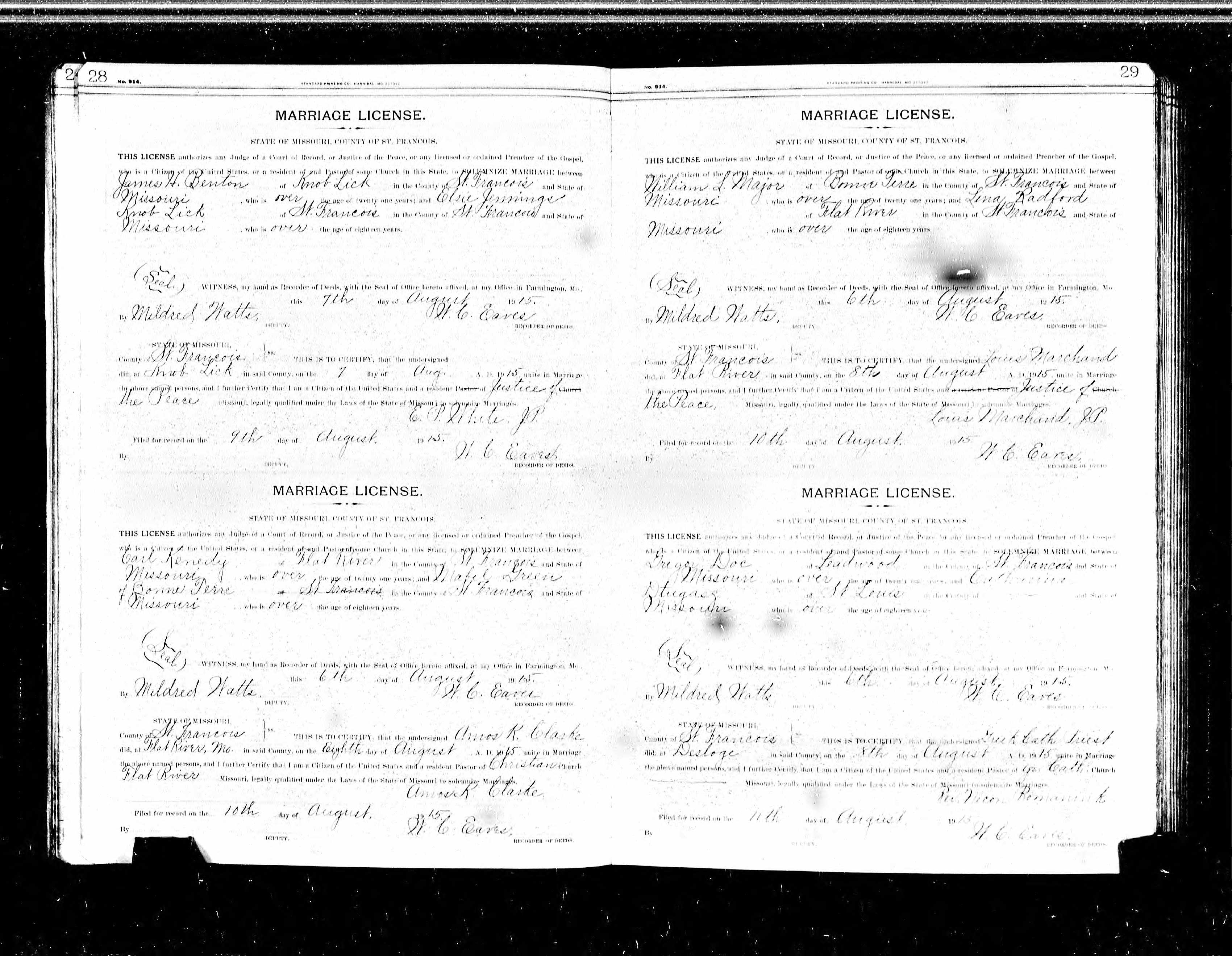 Missouri Marriage Record, Carl Kenedy and Mabel Green, William L. Major and Lina Radford