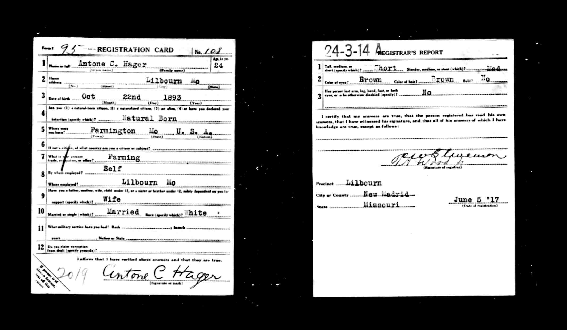 WWI Draft Registration, Antone C. Hager