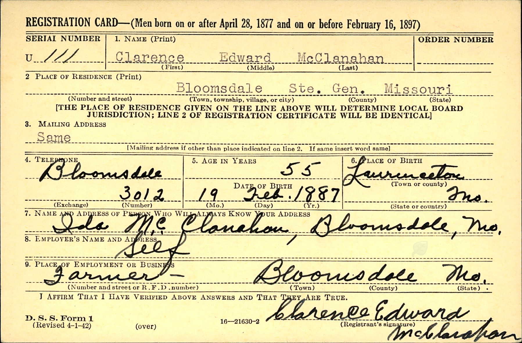 WWII Draft Registration, Clarence Edward McClanahan