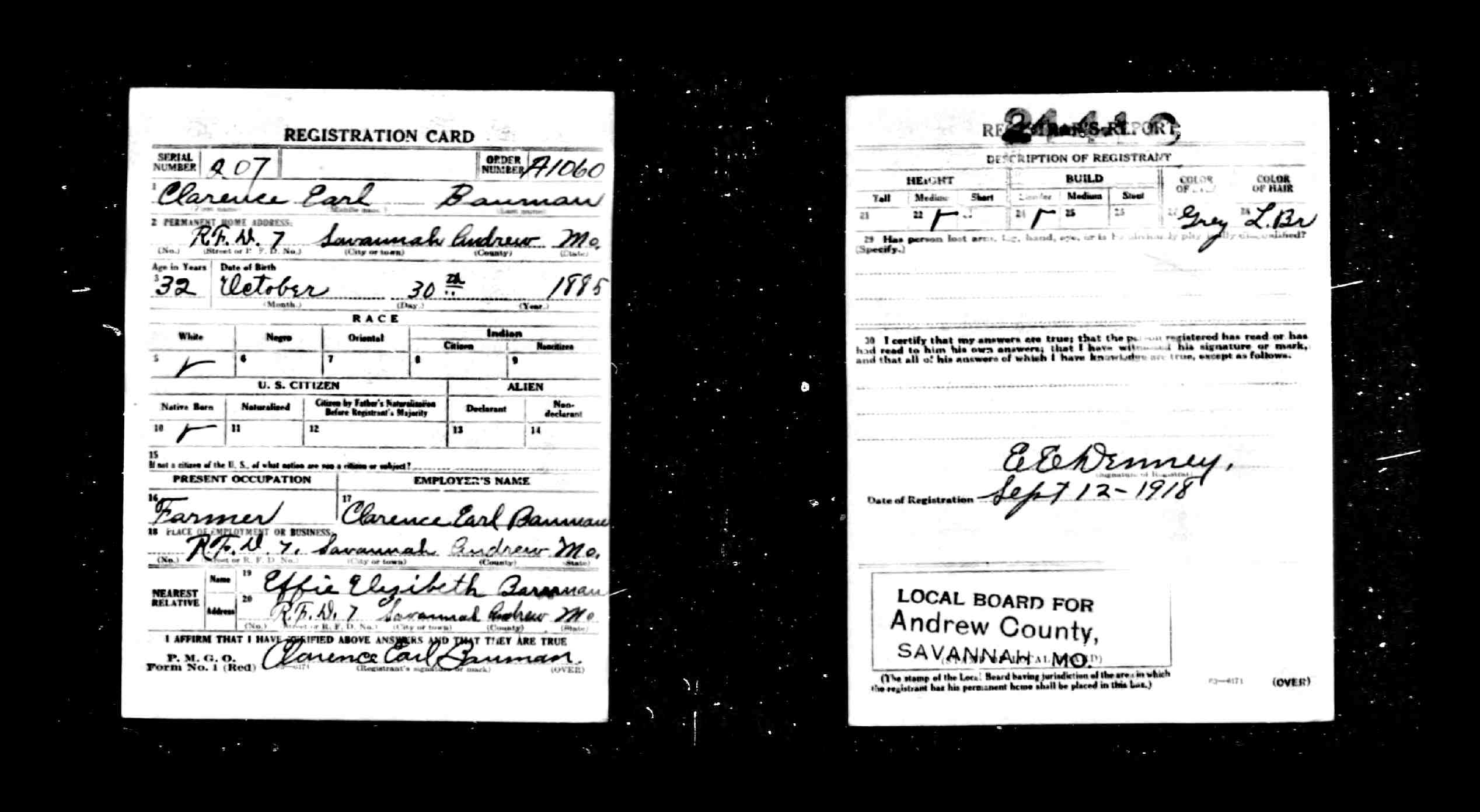 WWI Draft Registration, Clarence Earl Bauman