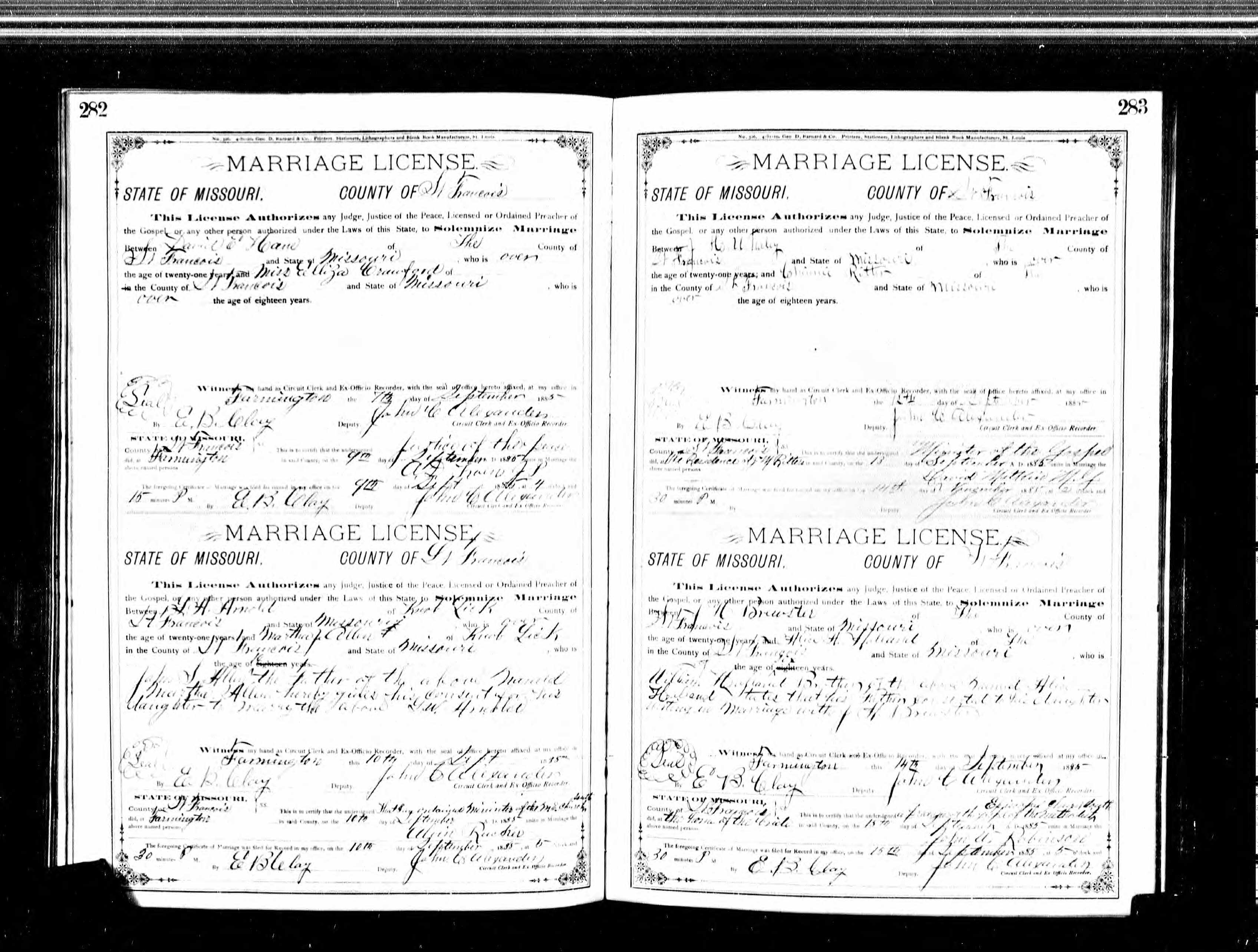 Missouri Marriage Record, J. H. Brewster and Alice H. Holland