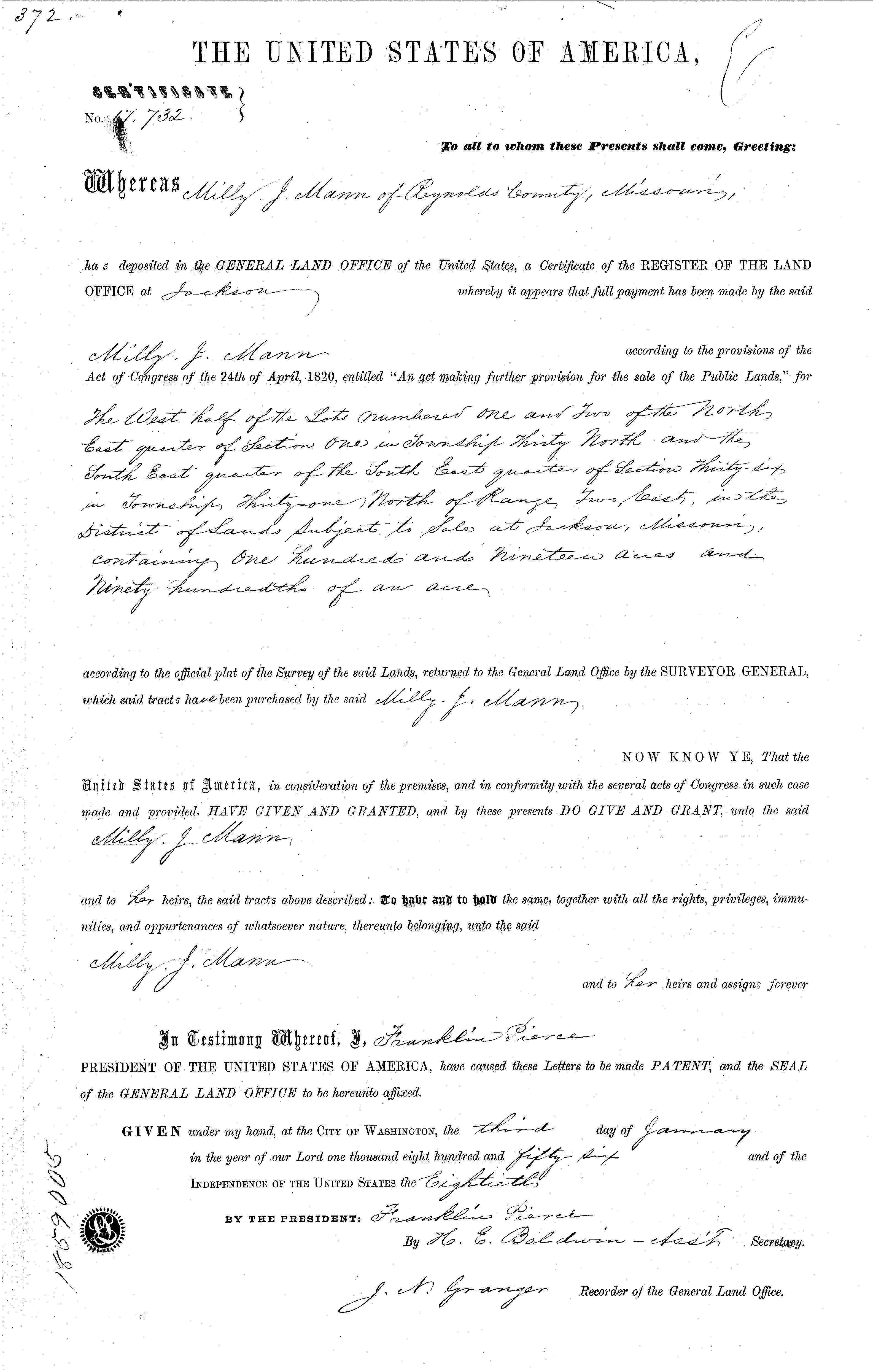 U.S. General Land Office Record, Milly J. Mann