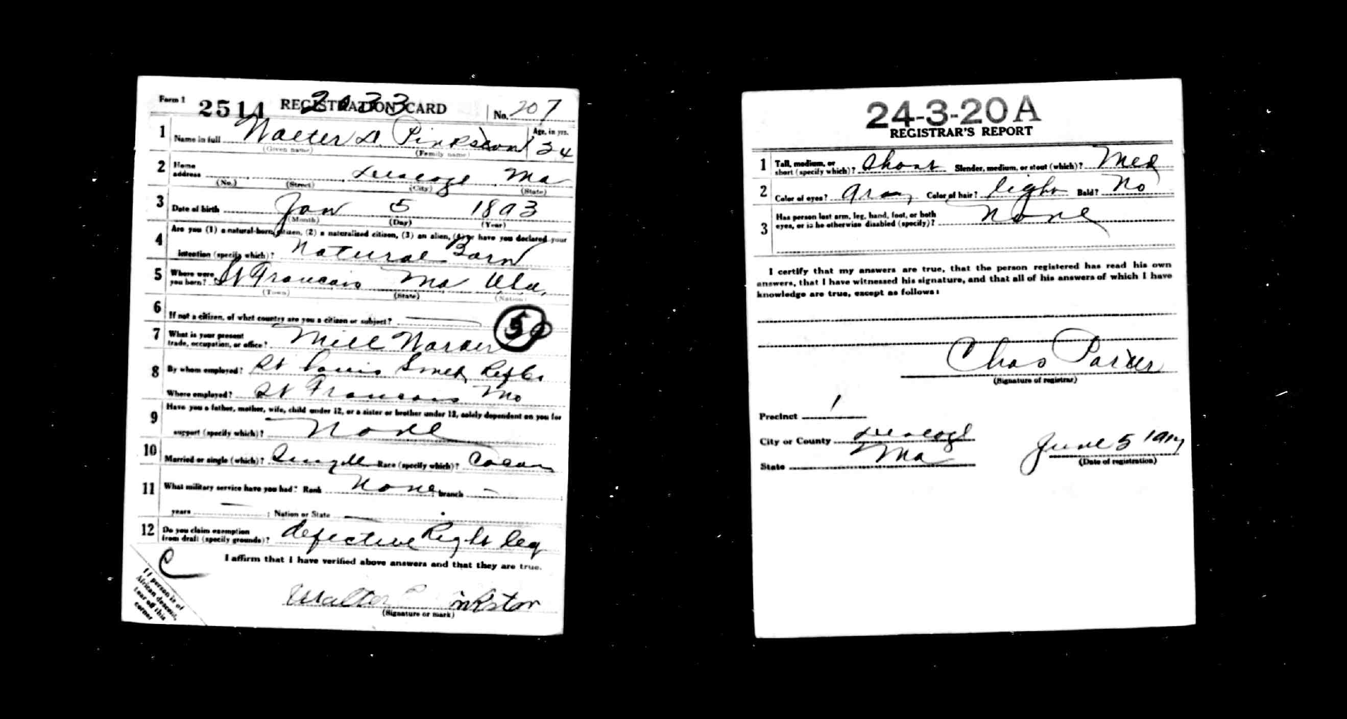 WWI Draft Registration, Walter E. Pinkston