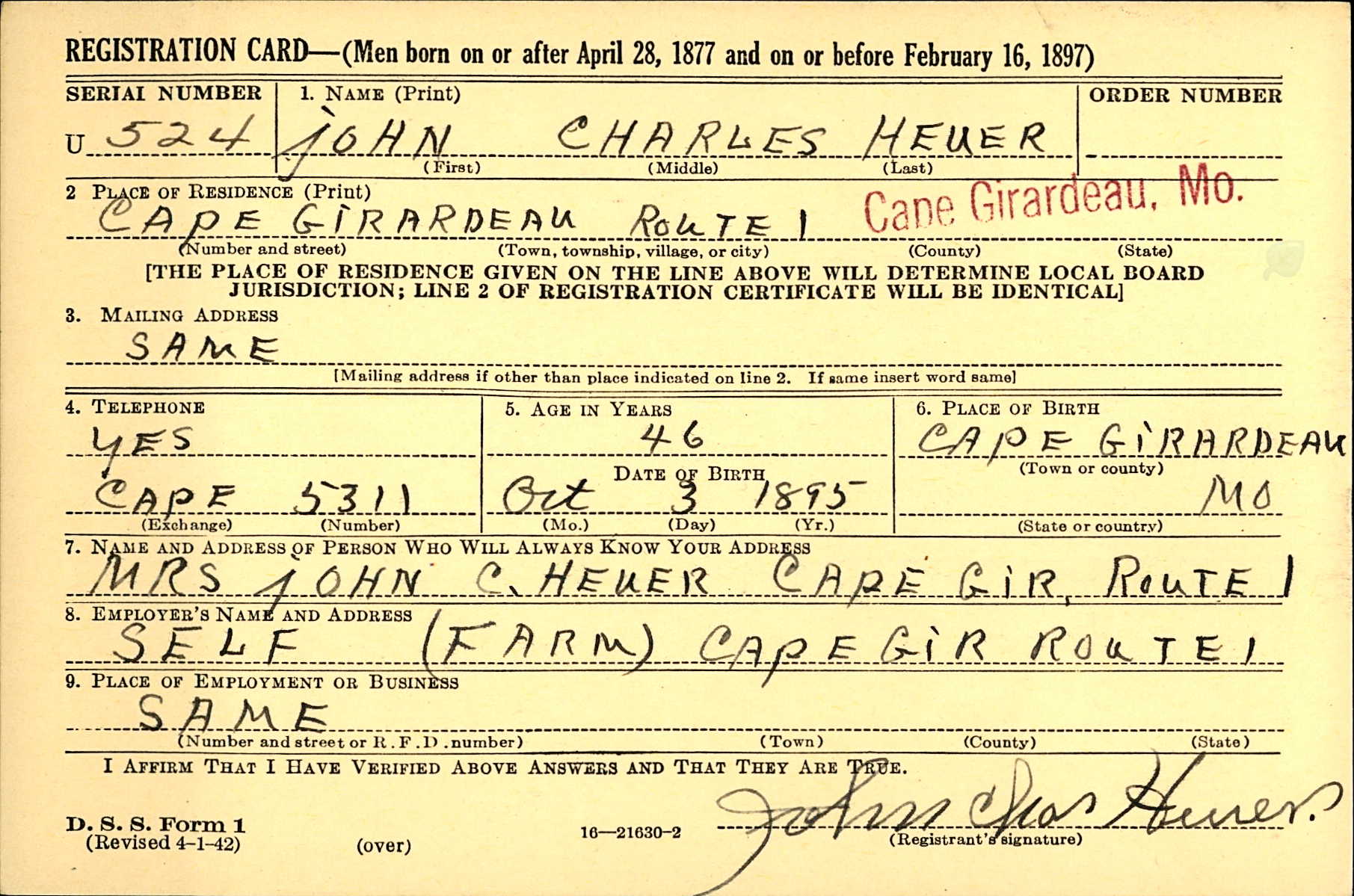 WWII Draft Registration, John Charles Heuer