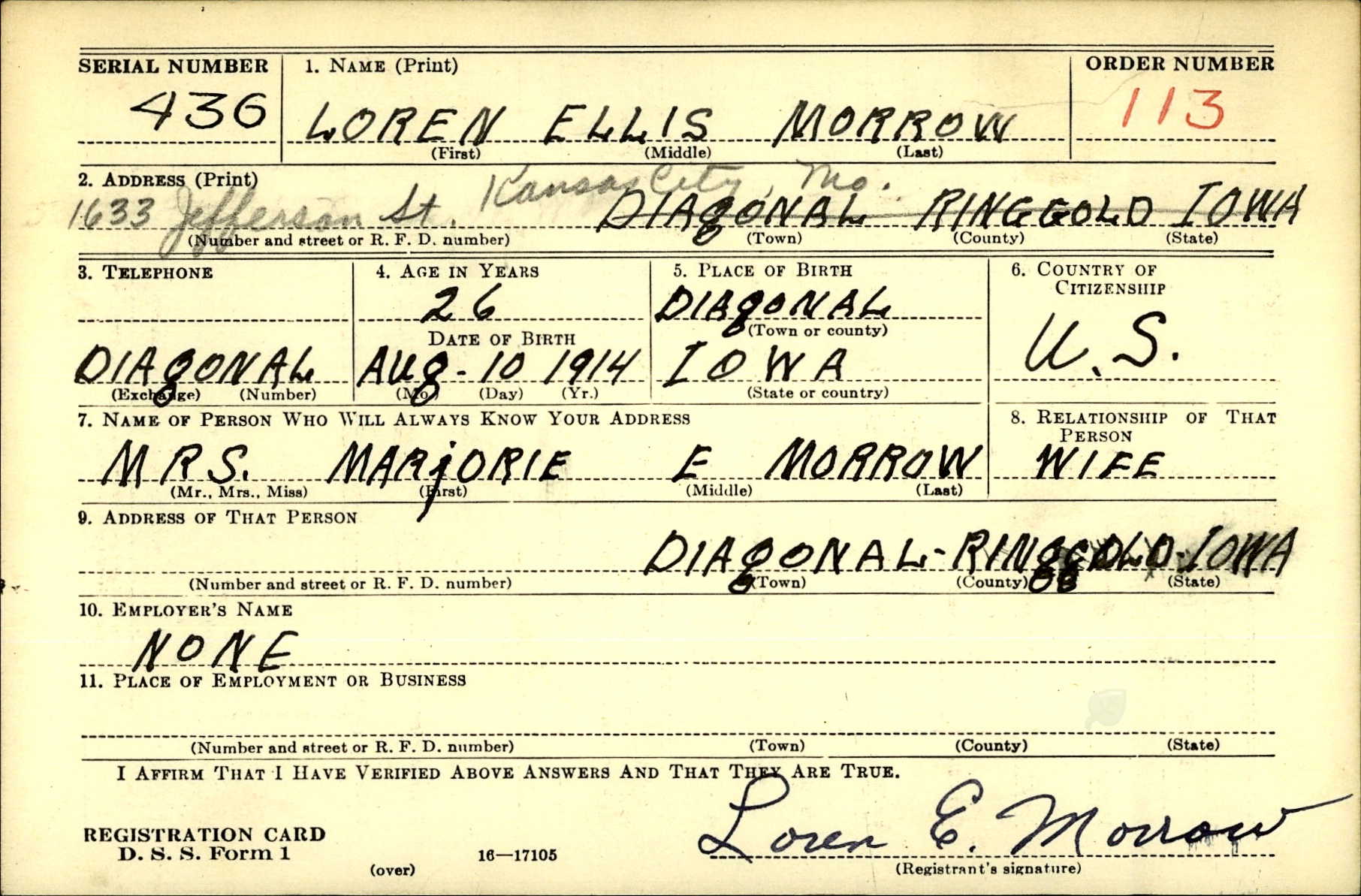 WWII Draft Registration, Loren Ellis Morrow