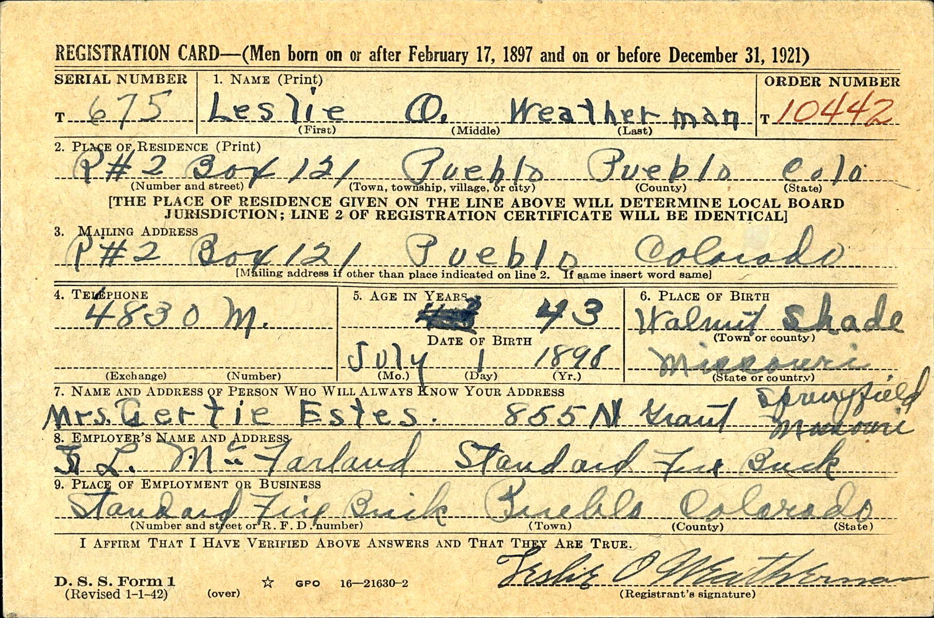 Draft Registration, Weatherman, Leslie O.