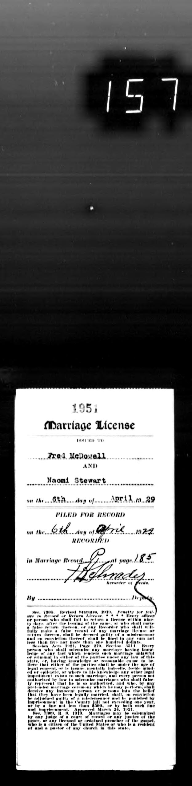 Missouri Marriage Record, Fred McDowell and Naomi Stewart