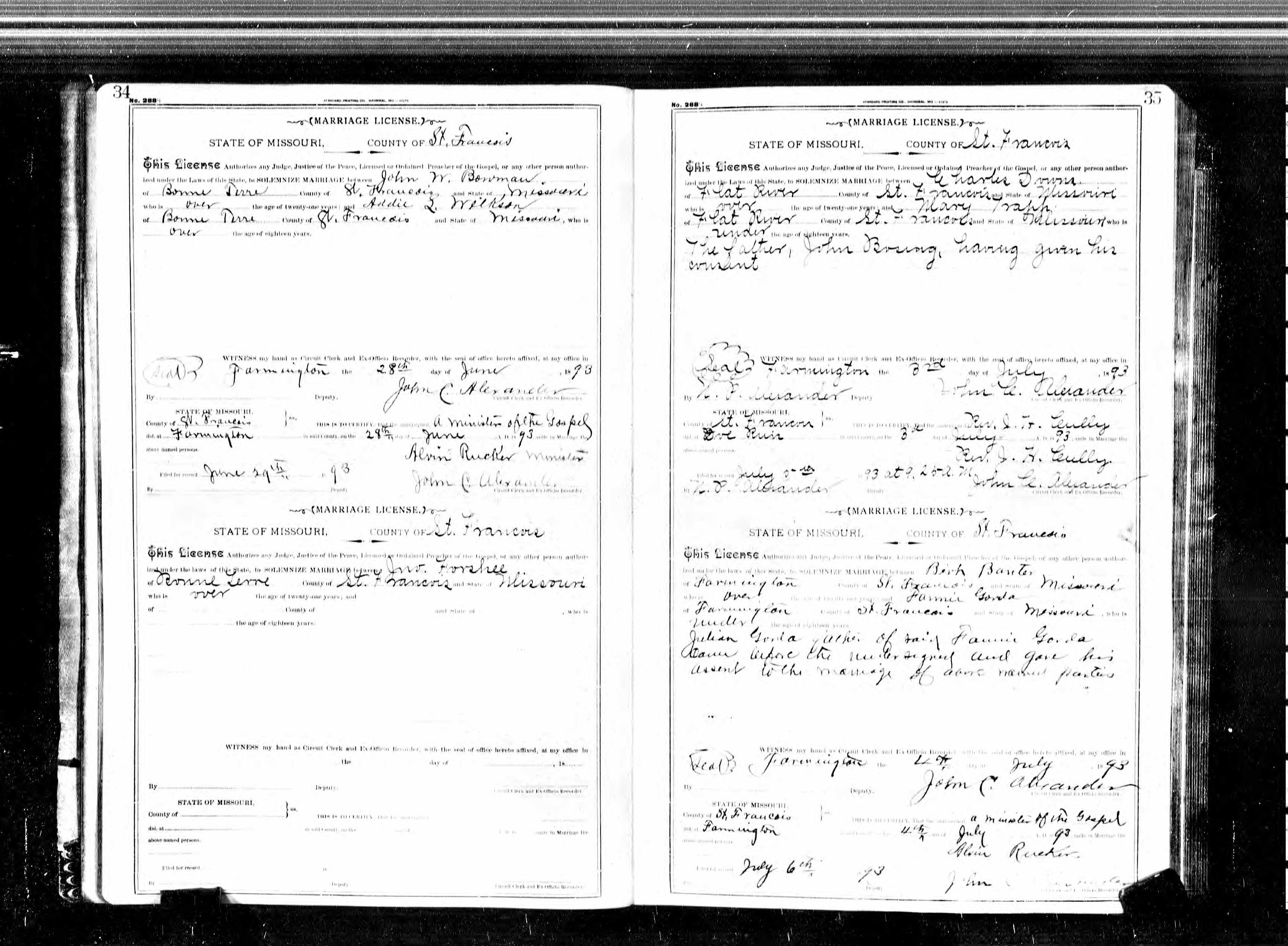 Missouri Marriage Record, John W. Bowman and Addie L. Wilkson