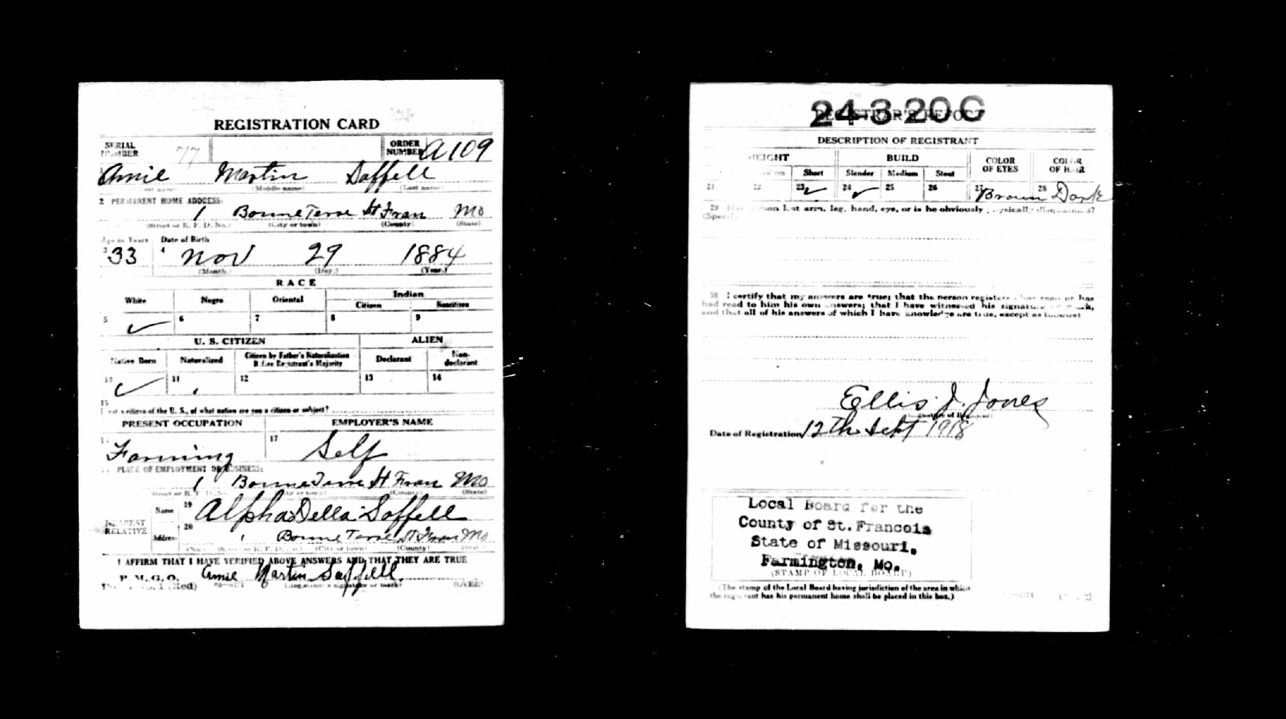 WWI Draft Registration, Amie Martin Saffell