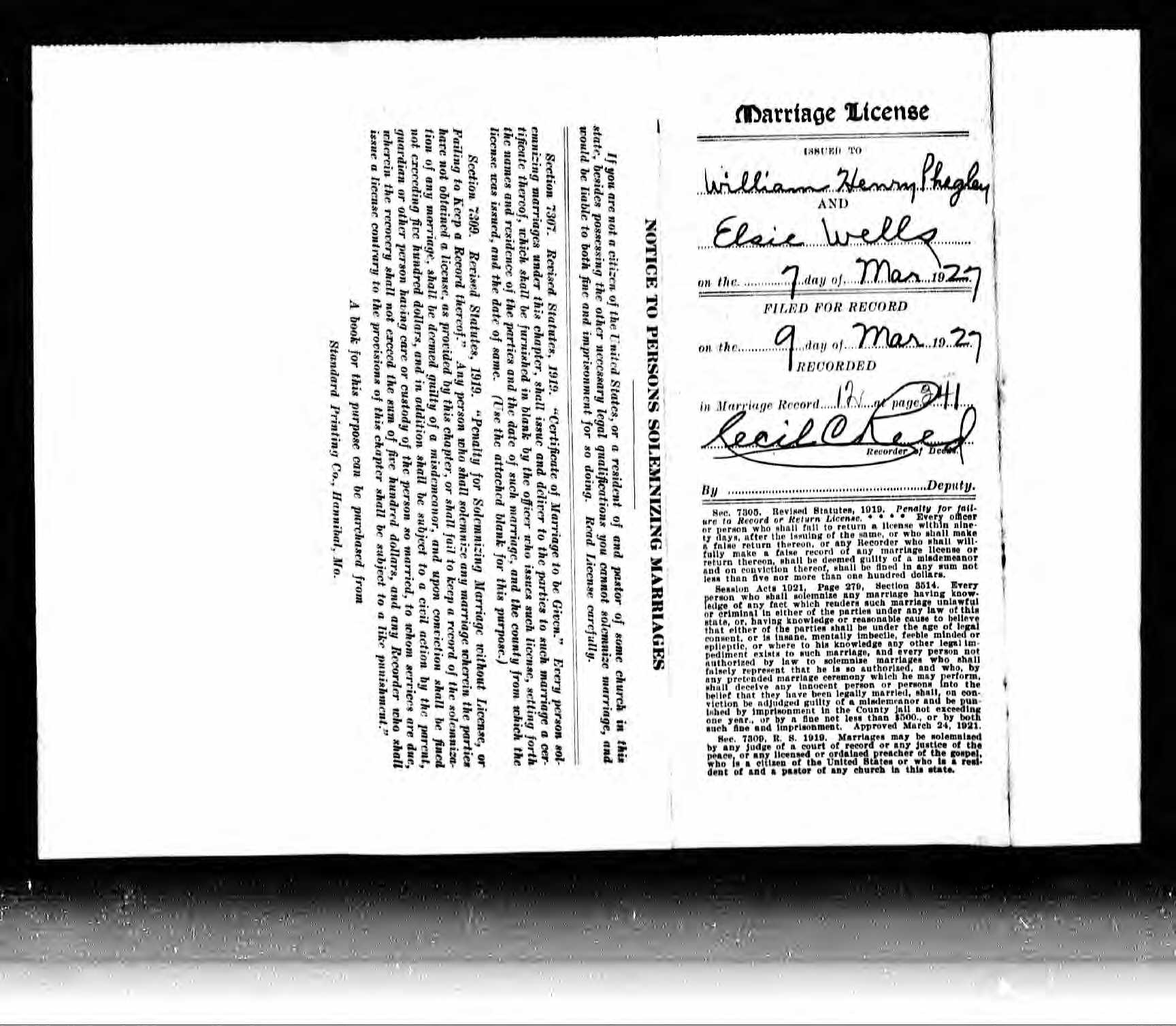 Missouri Marriage Record, William Henry Phegley and Elsie Wells
