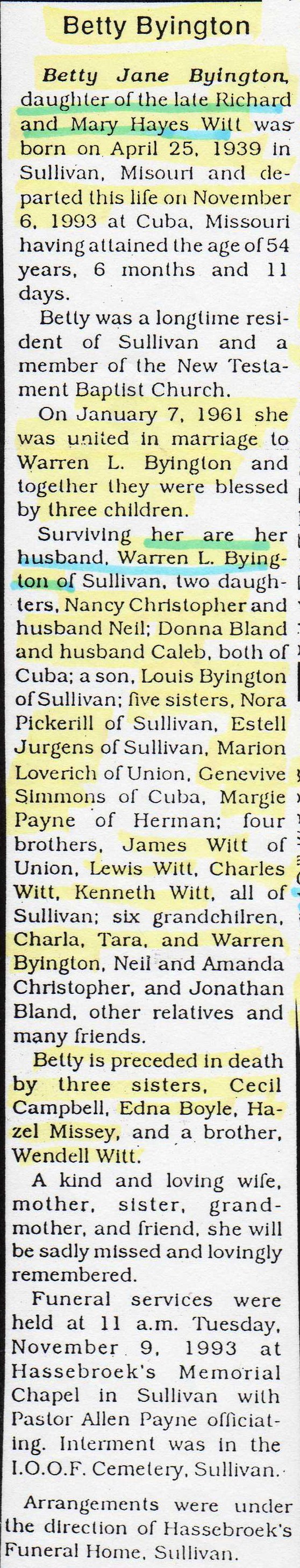 Obituary, Betty Byington
