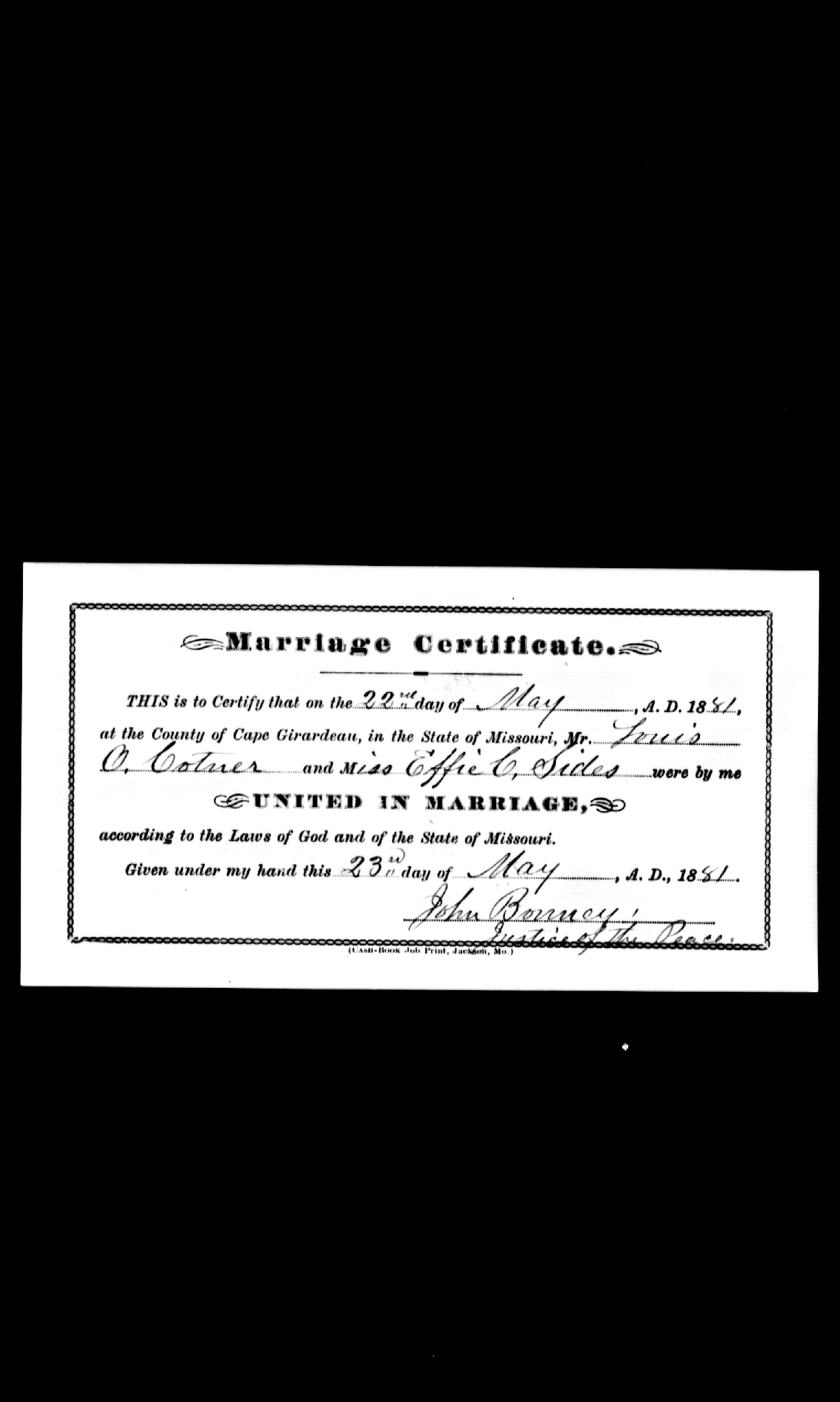 Missouri Marriage Record, Louis C. Cotner and Effie C. Sides