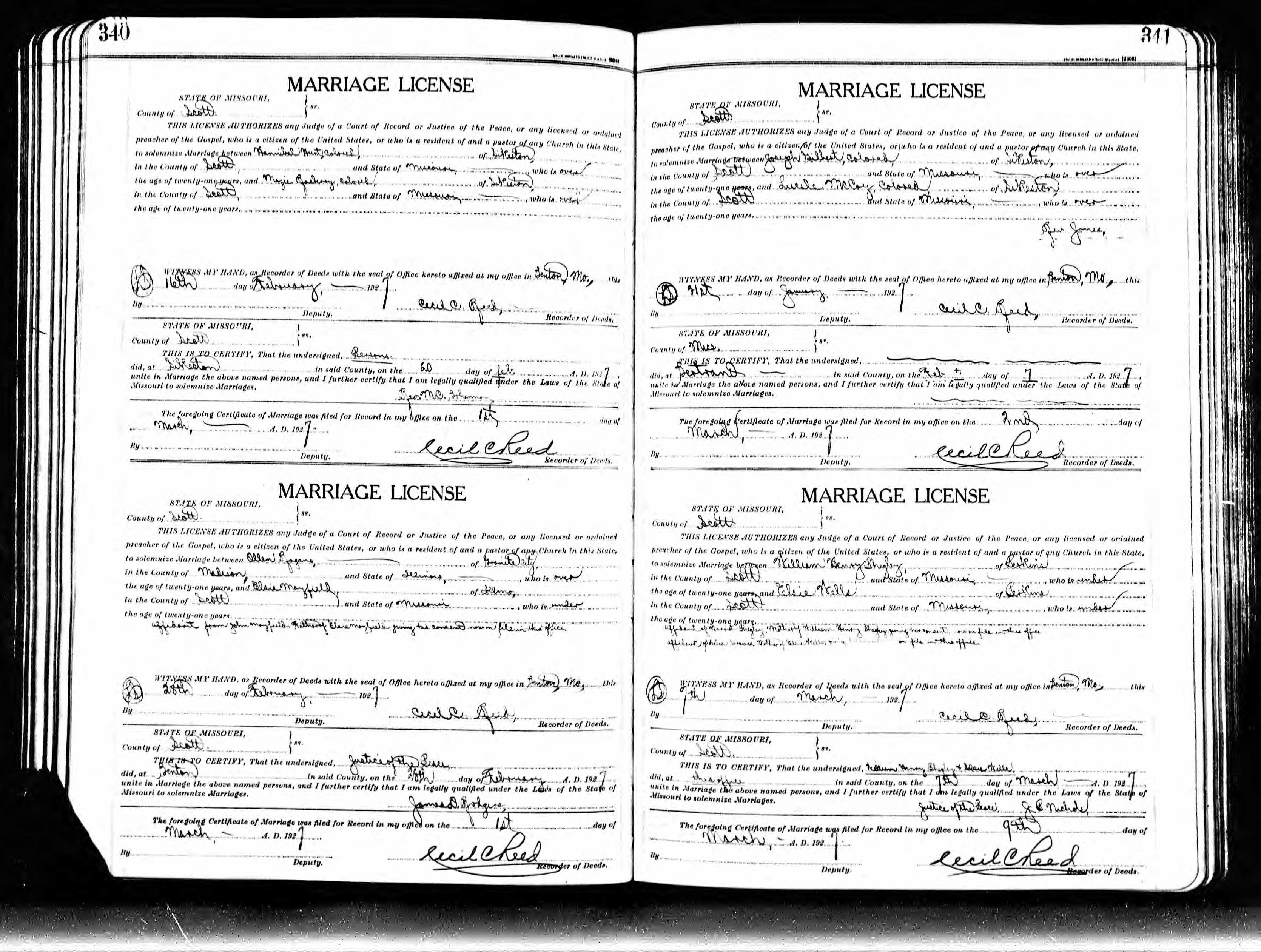 Missouri Marriage Record, William Henry Phegley and Elsie Wells