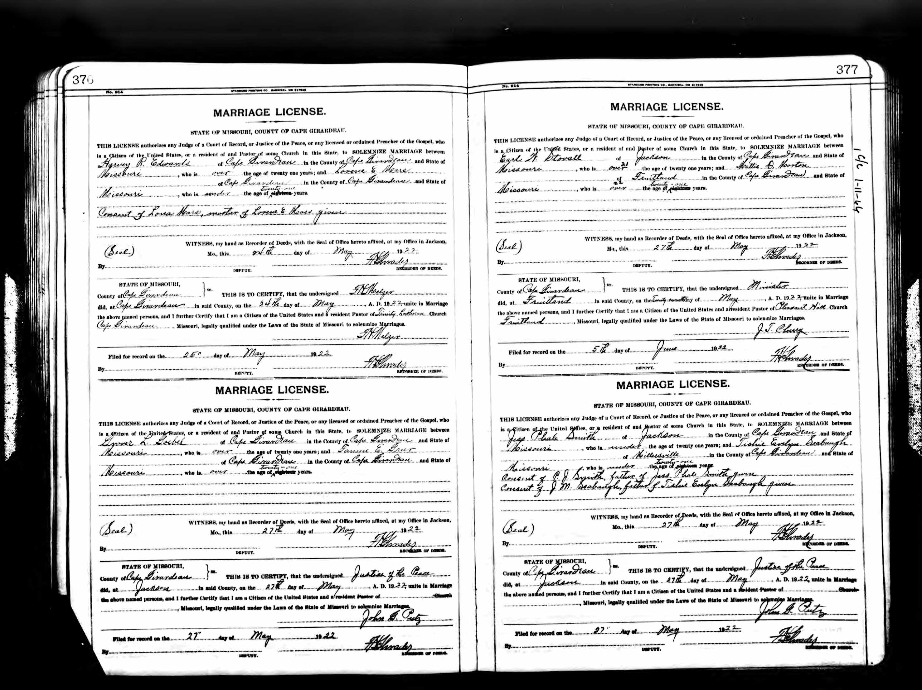 Missouri Marriage Record, Earl W. Stovall and Mattie D. Morton