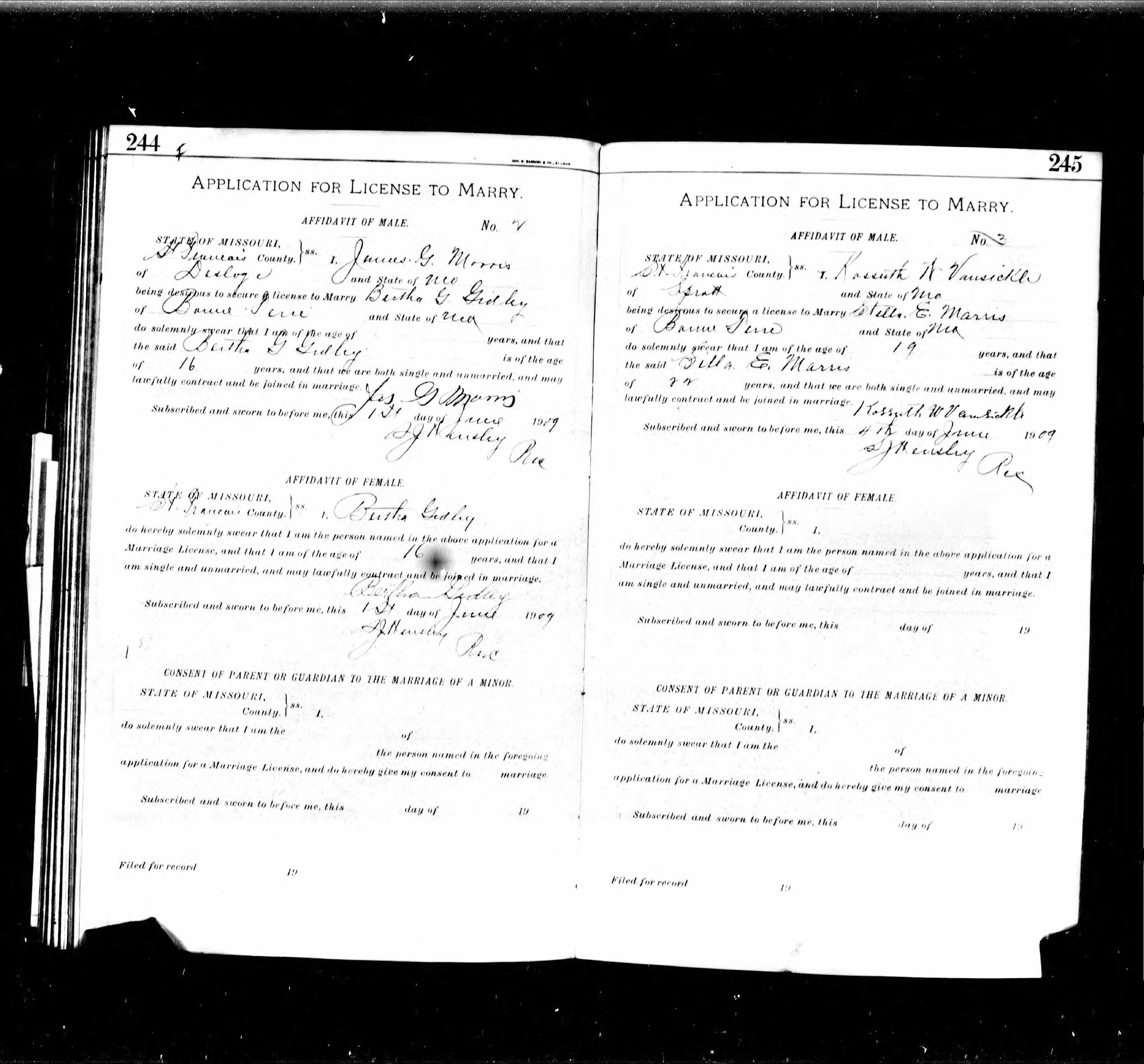 Missouri Marriage Application, Kossuth W. Vansickle and Stella E. Marris