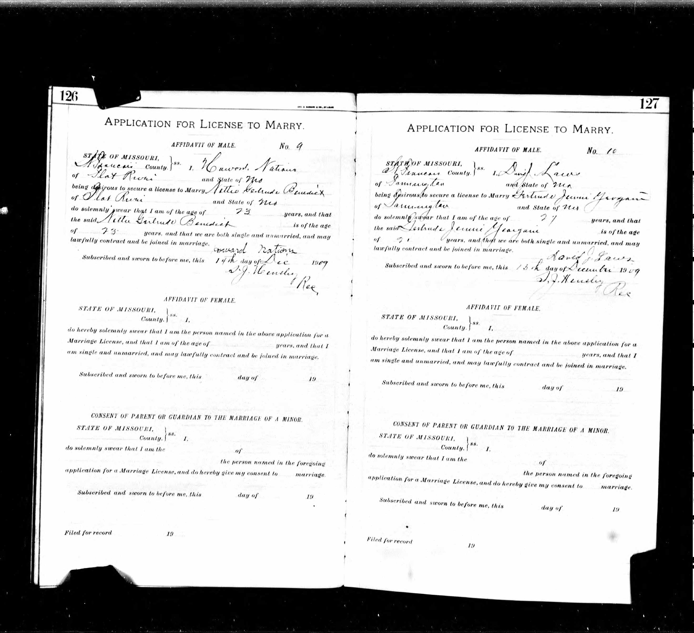 Missouri Marriage Application, David Laws and Gertrude Jennie Yeargain