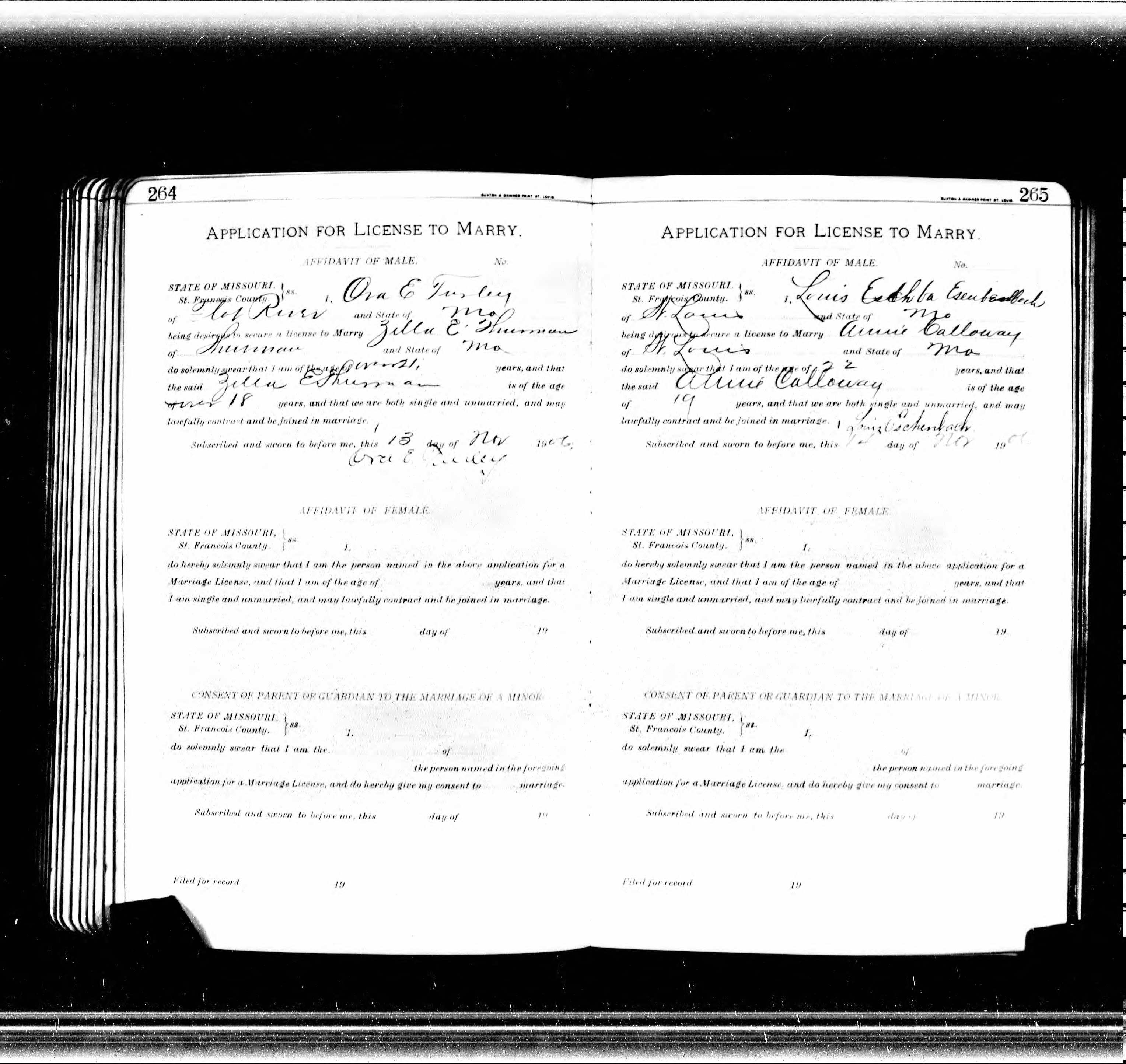 Missouri Marriage Application, Ora E. Turley and Zella E. Thurman