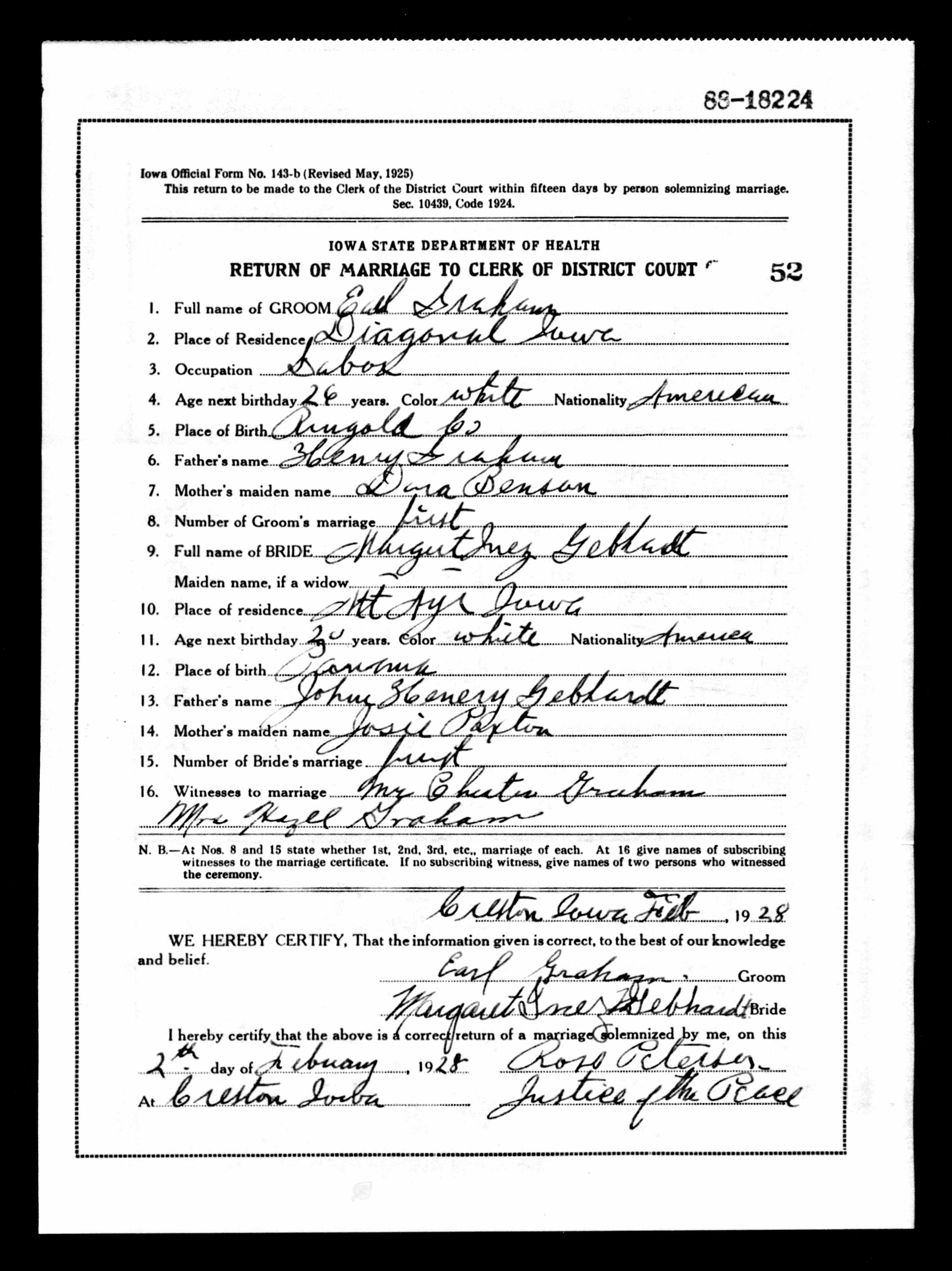 Iowa Marriage Record, Earl Graham and Margaret Inez Gebhardt
