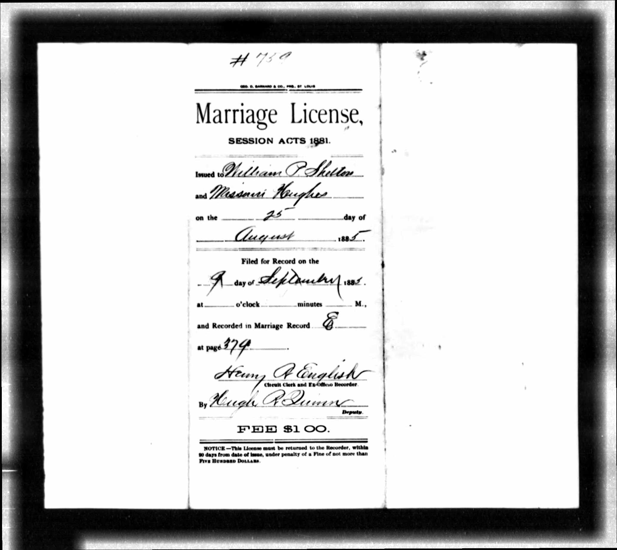 Missouri Marriage Record, William P. Shelton and Missouri Hughes