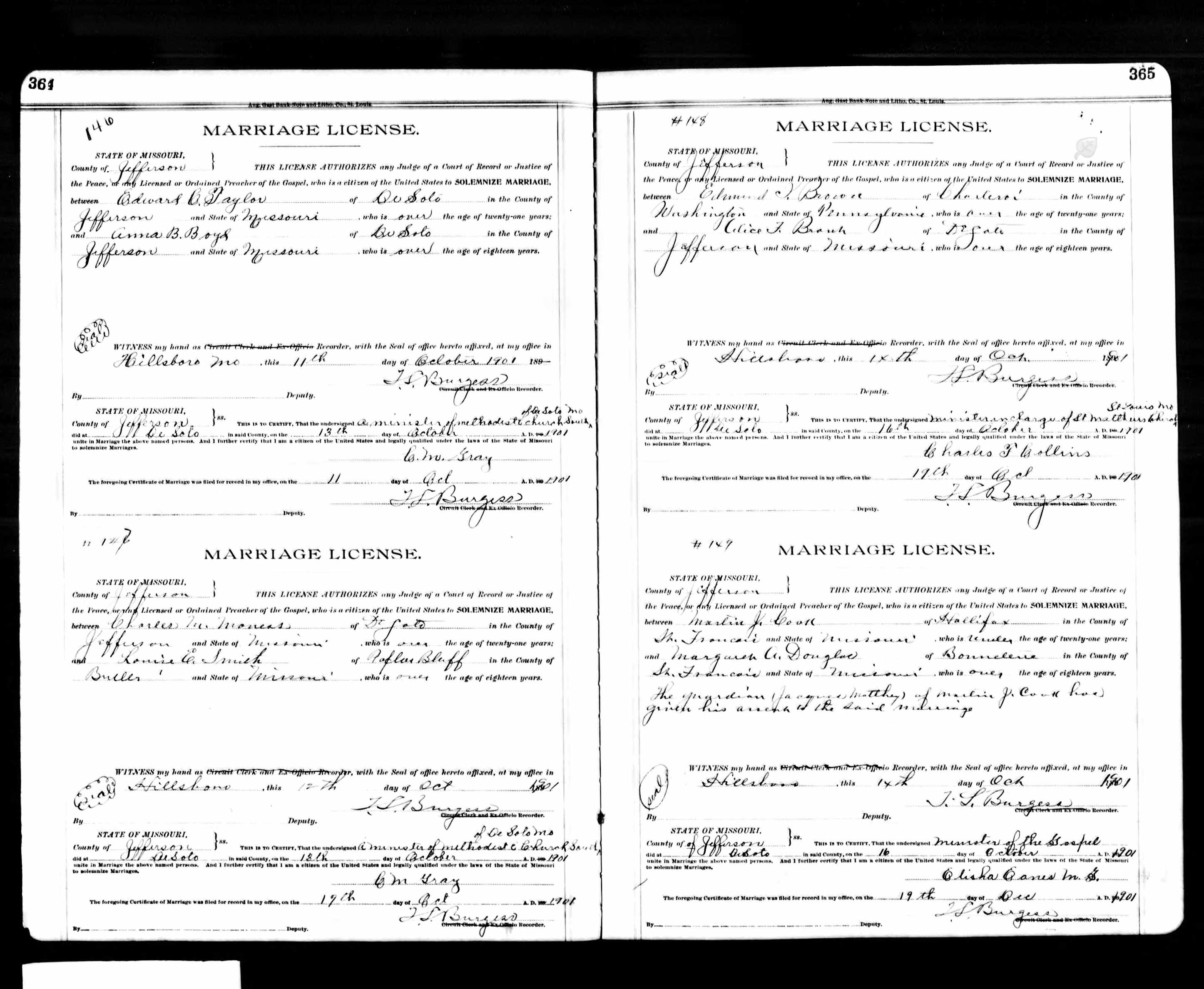 Missouri Marriage Record, Martin J. Cook and Margaret A. Douglas