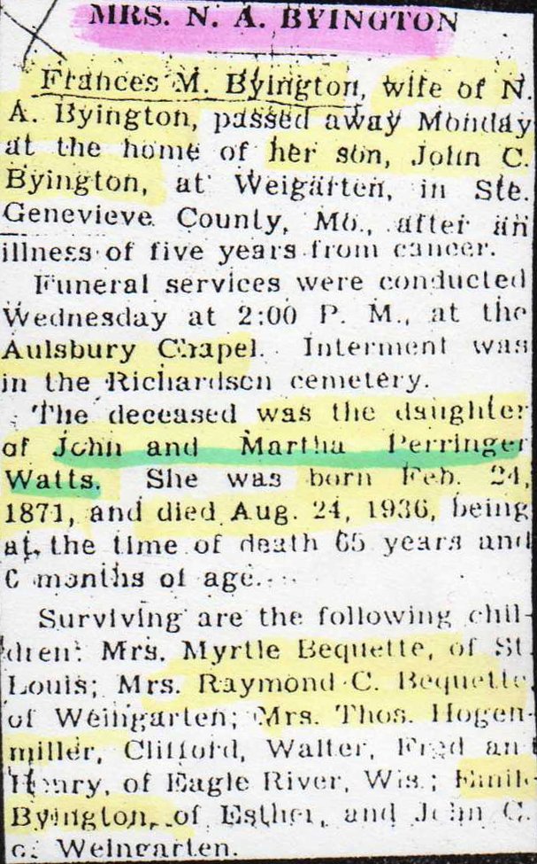Obituary, Mrs. N. A. Byington