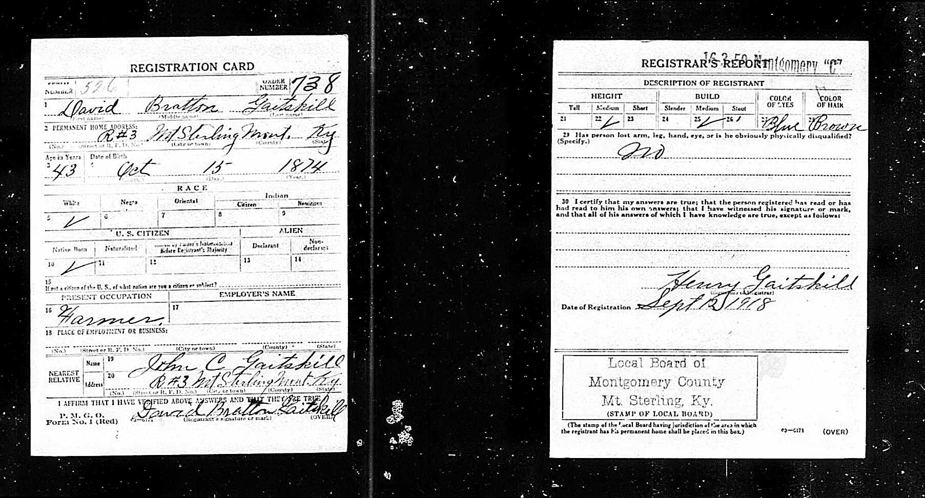 WWI Draft Registration, David Bratton Gaitskill