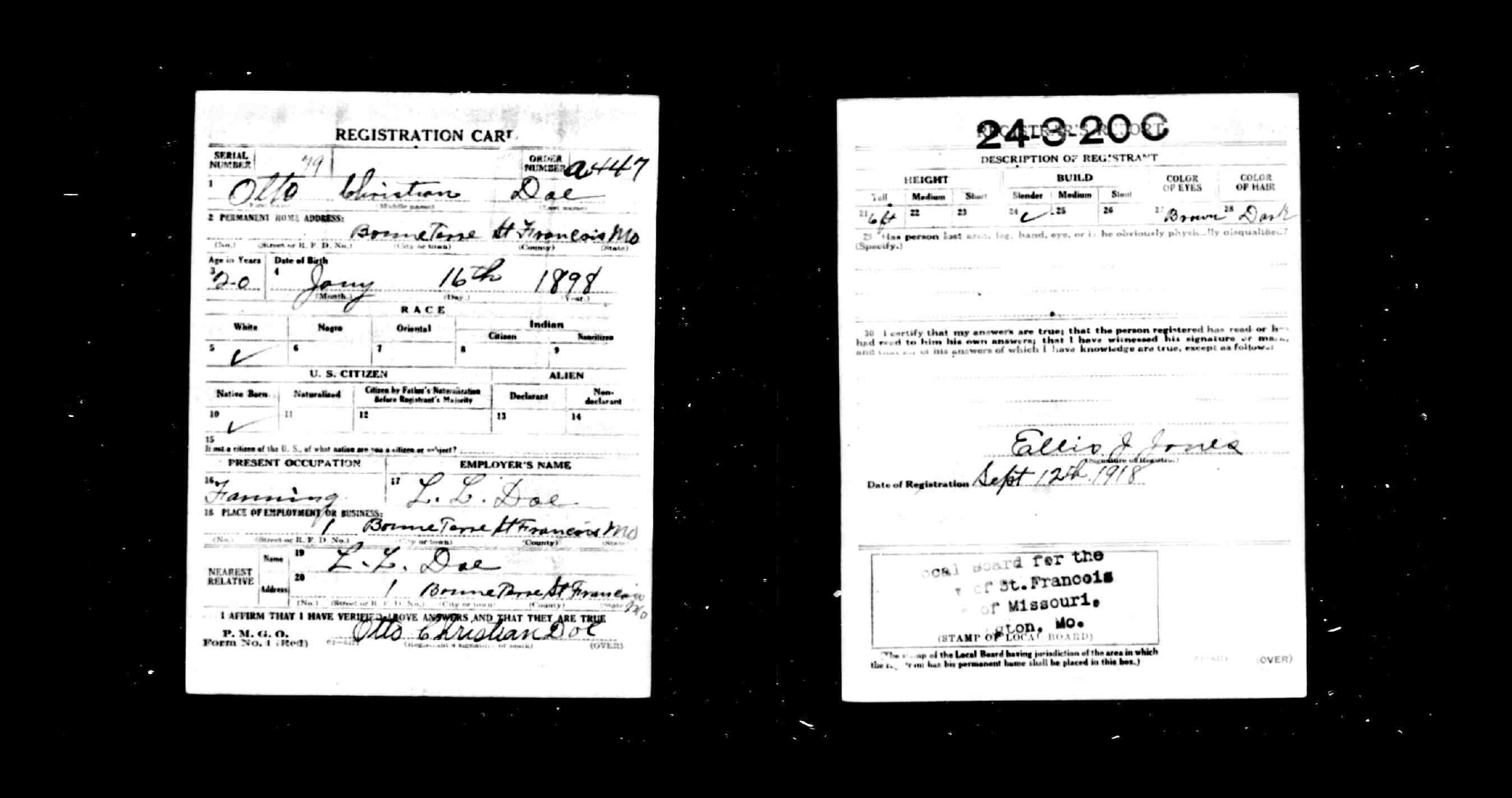 WWI Draft Registration, Otto Christian Doe
