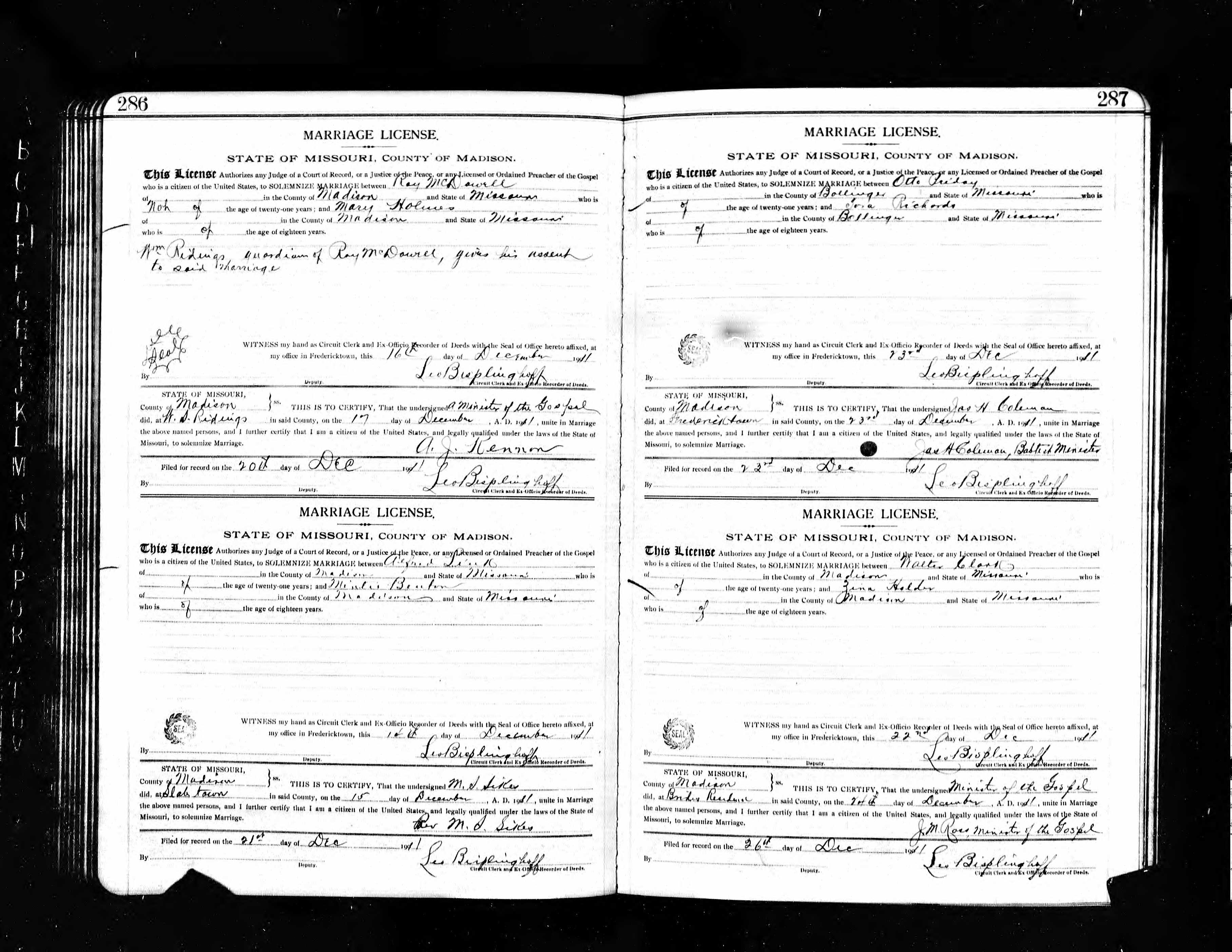Missouri Marriage Record, Roy McDowell and Mary Holmes