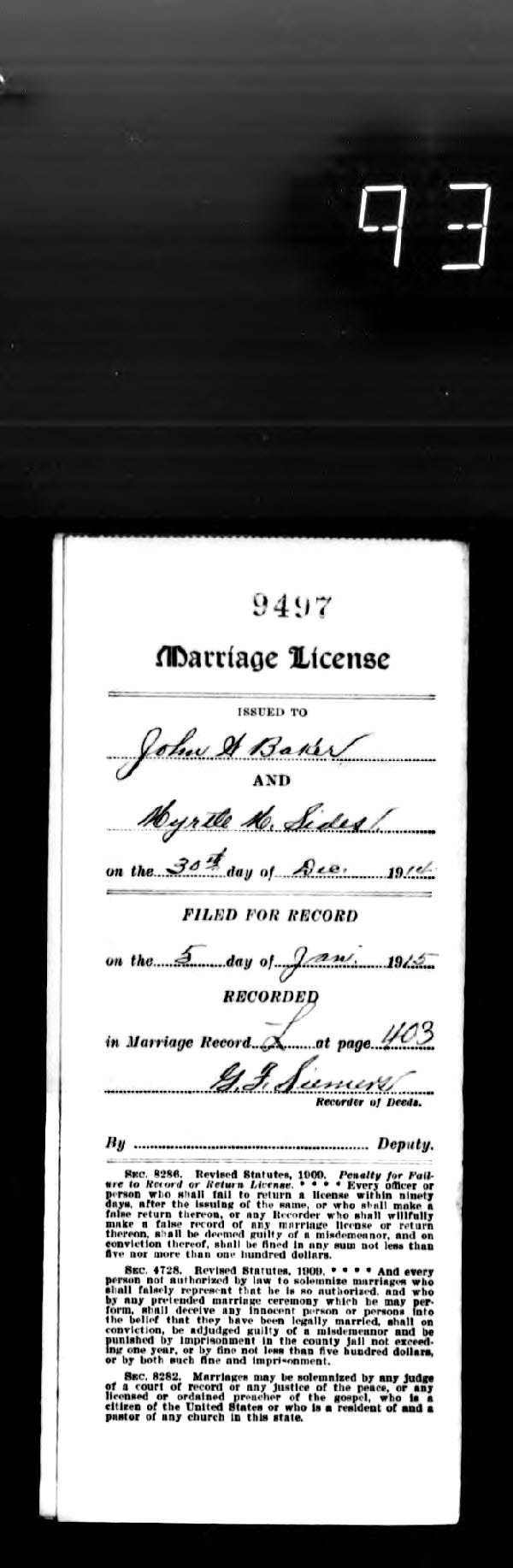 Missouri Marriage Record, John W. Baker and Myrtle M. Sides
