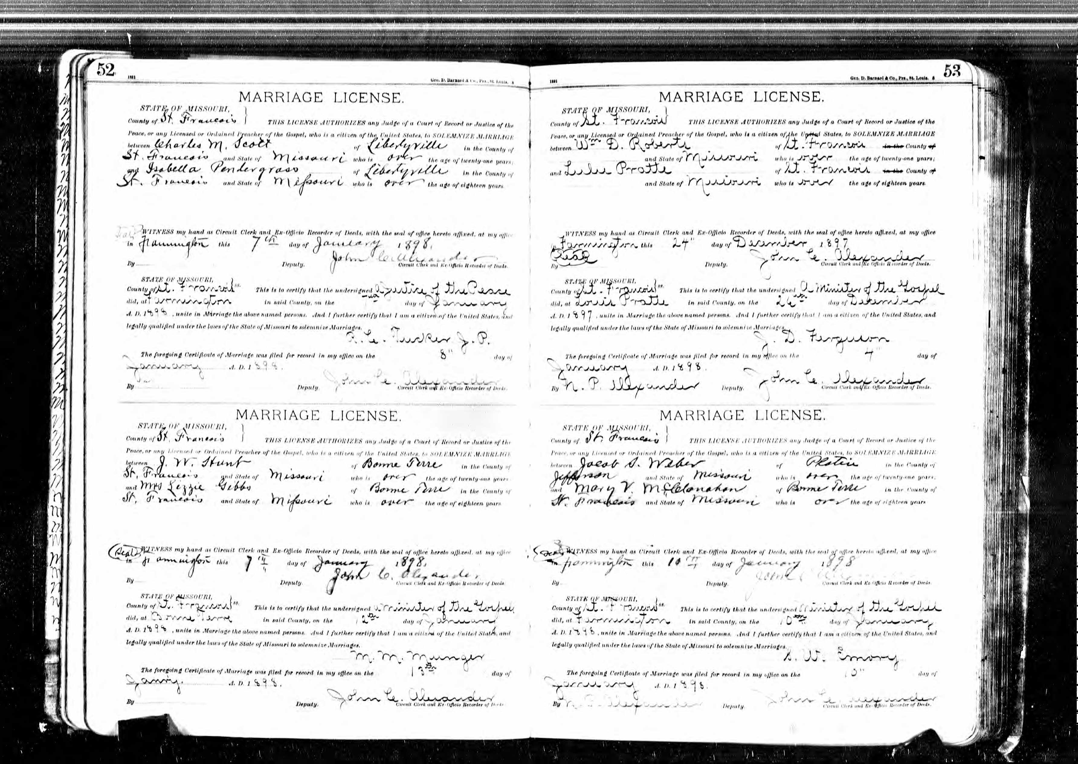 Missouri Marriage Records, J. W. Hunt and Mrs. Lizzie Gibbs, William D. Roberts and Lulu Pratte