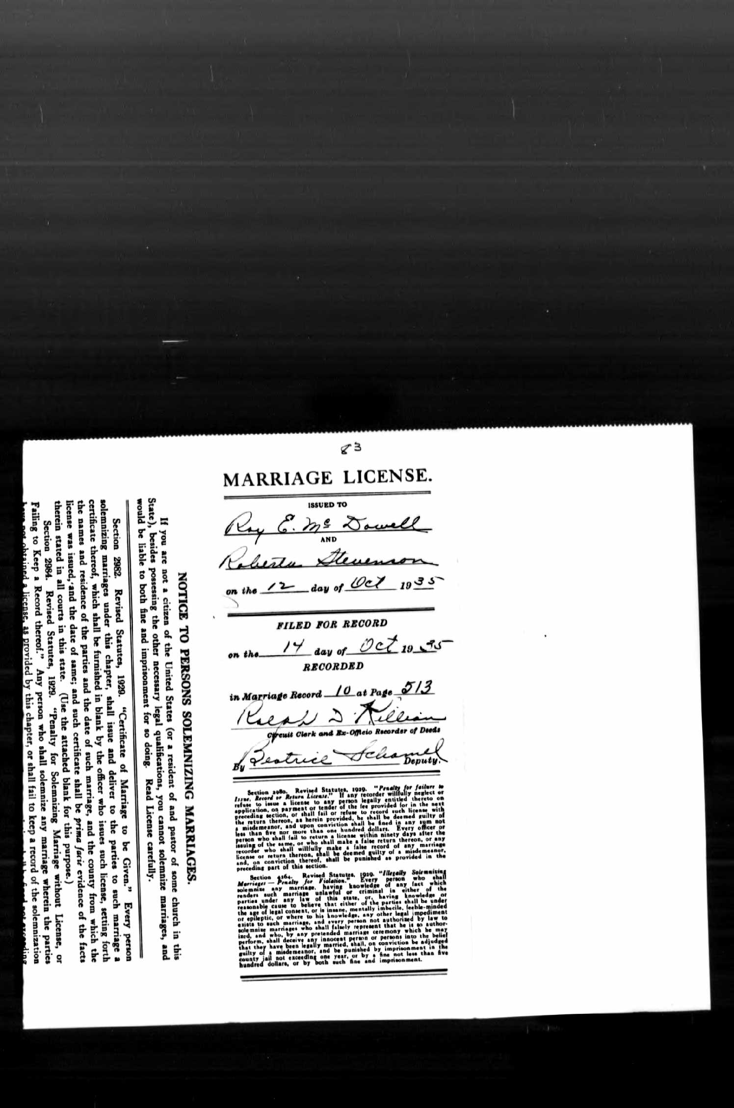 Missouri Marriage Record, Roy E. McDowell and Roberta Stevenson