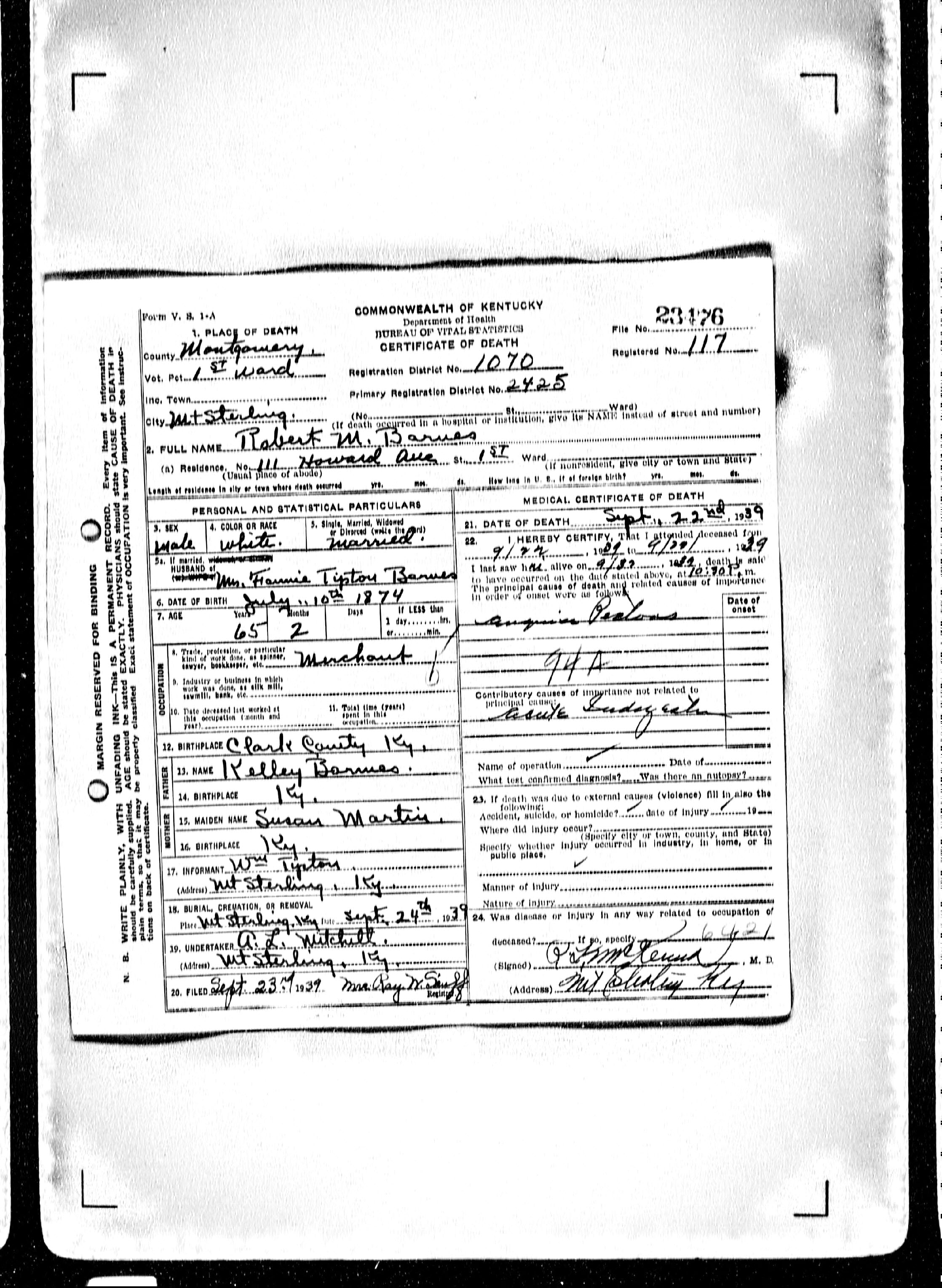 Death Certificate, Robert M. Barnes