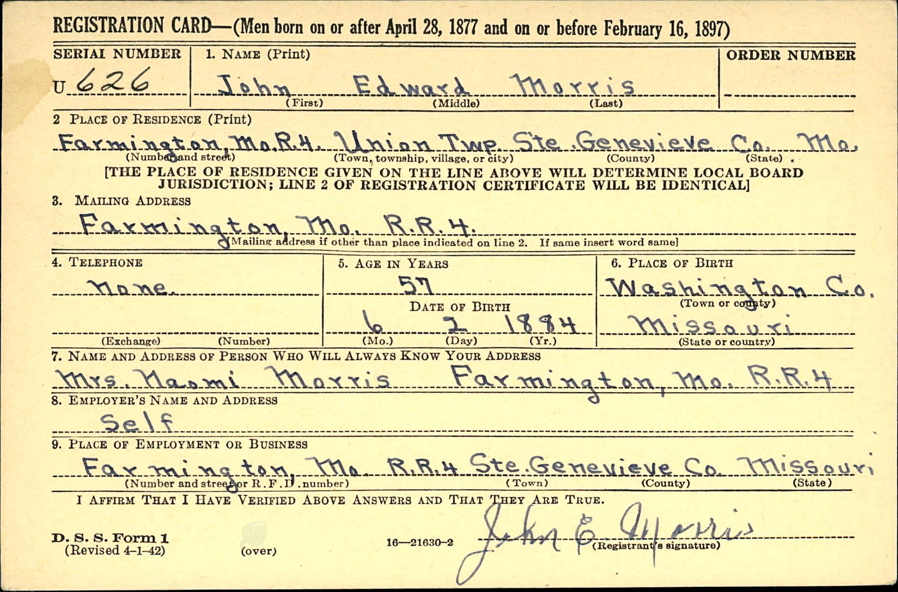 WWII Draft Registration, John Edward Morris