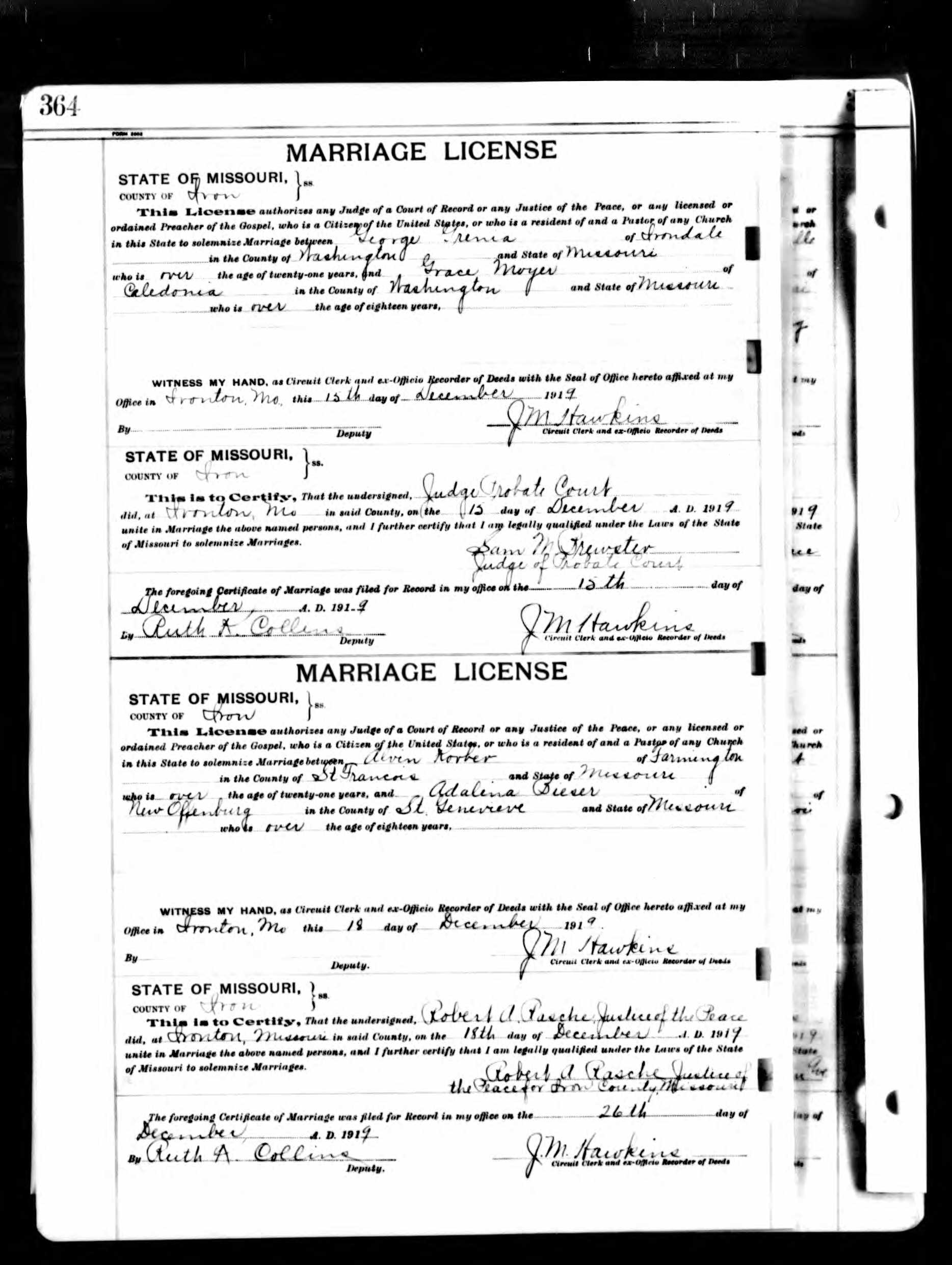 Missouri Marriage Record, Alvin Korber and Adalina Bieser
