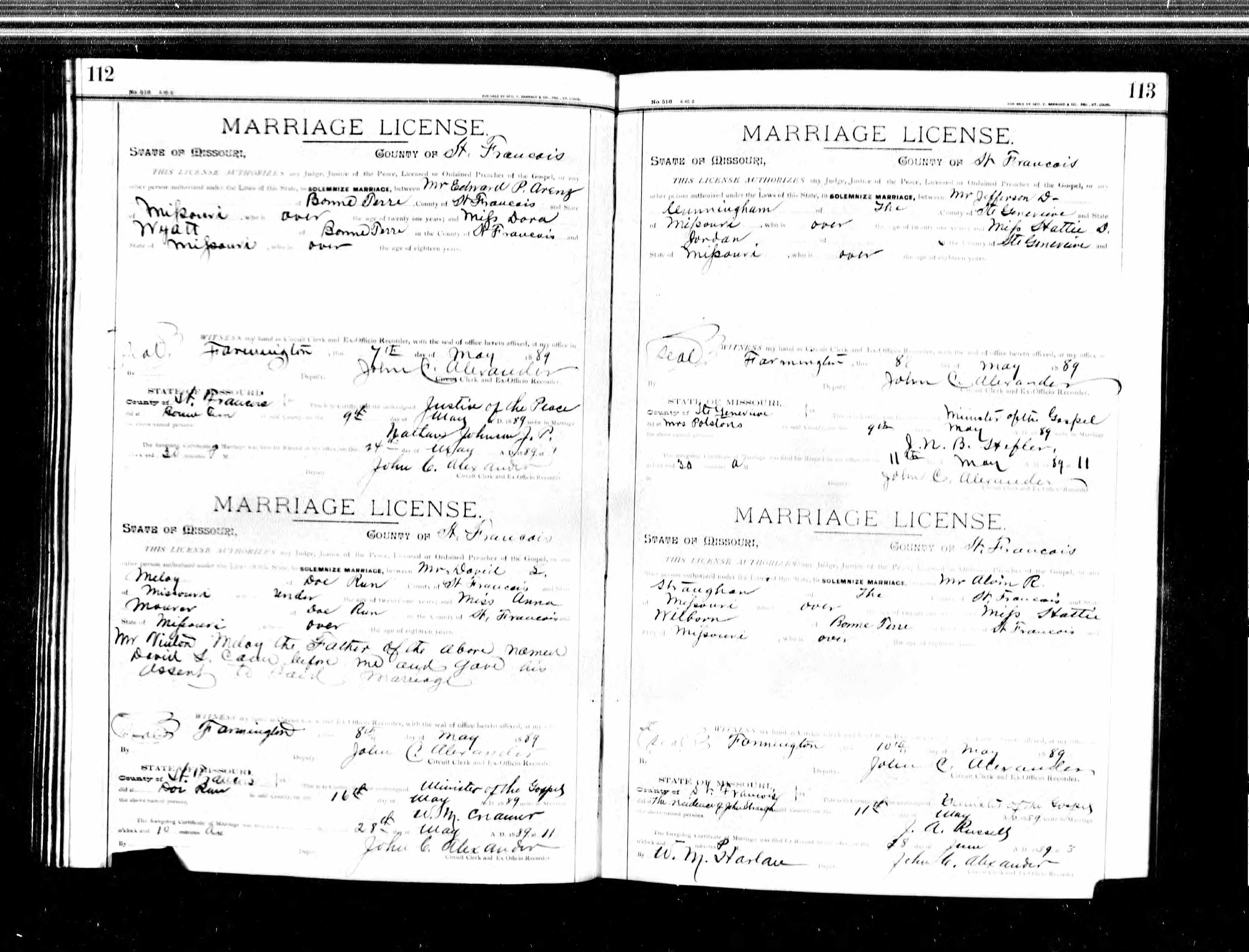Missouri Marriage Records, Jefferson D. Dunningham and Hattie D. Jordan, Alvin R. Straughan and Hattie Wilborn