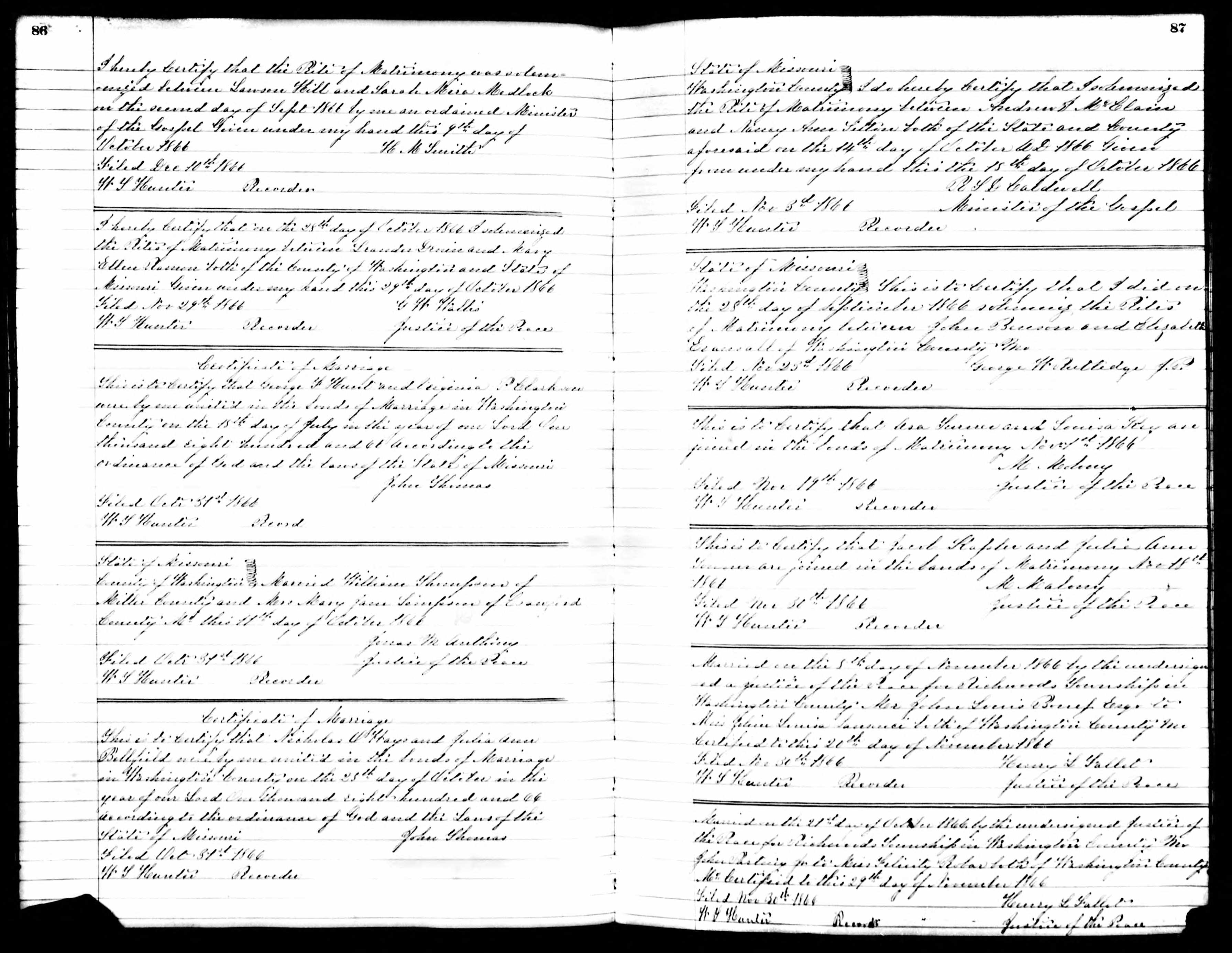 Missouri Marriage Record, Nicholas O. Hays and Julia Ann Bellfield