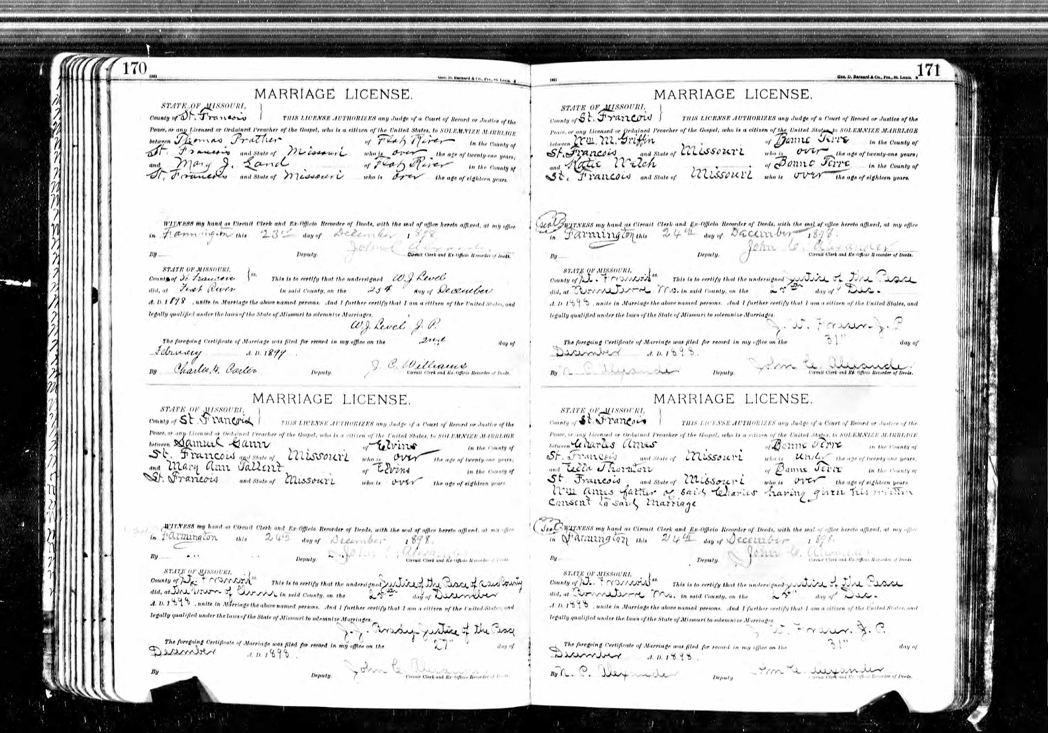 Missouri Marriage Record, Thomas Prather and Mary J. Land, Charles Ames and Ella Thornton
