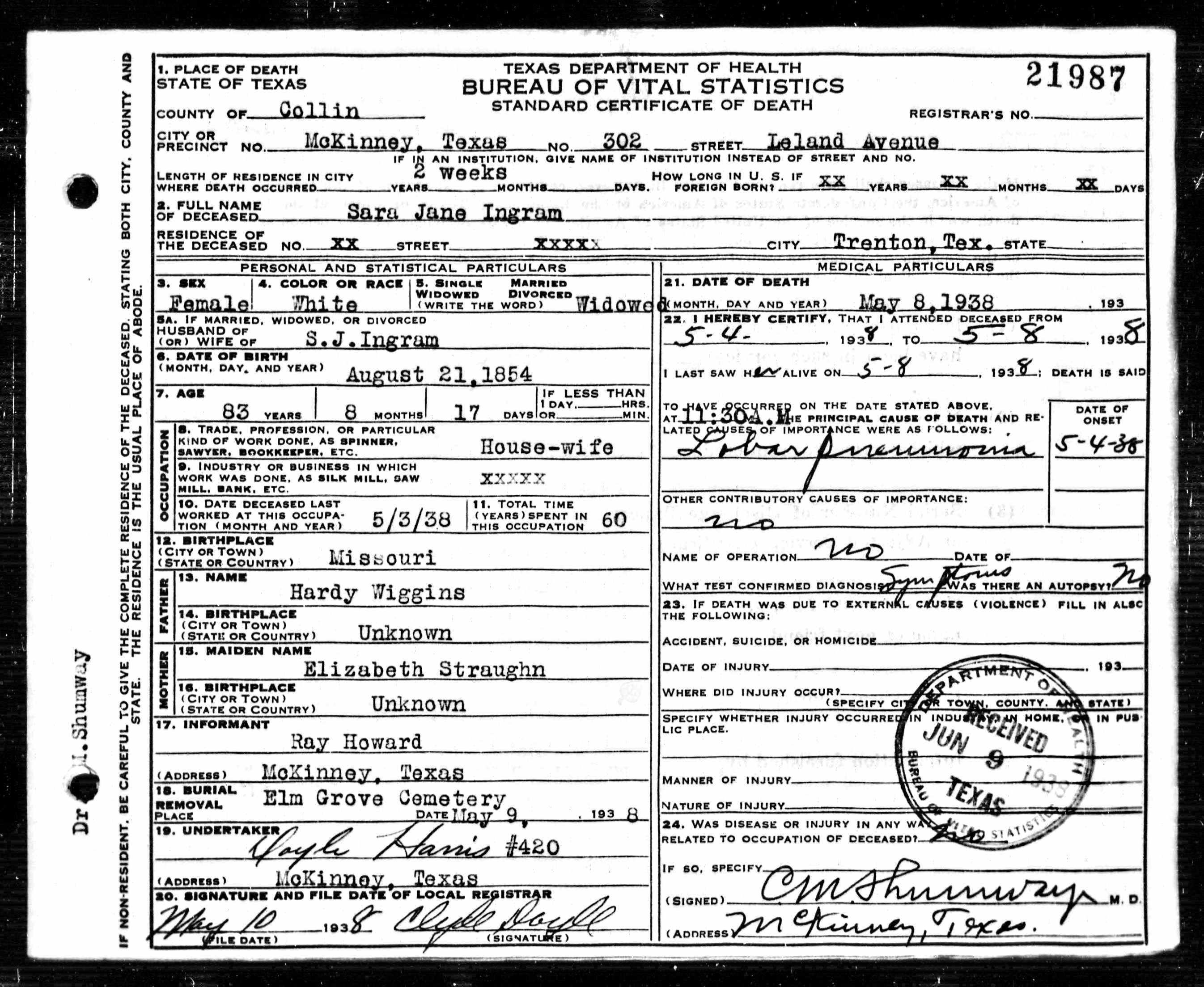 Death Certificate, Sara Jane Ingram