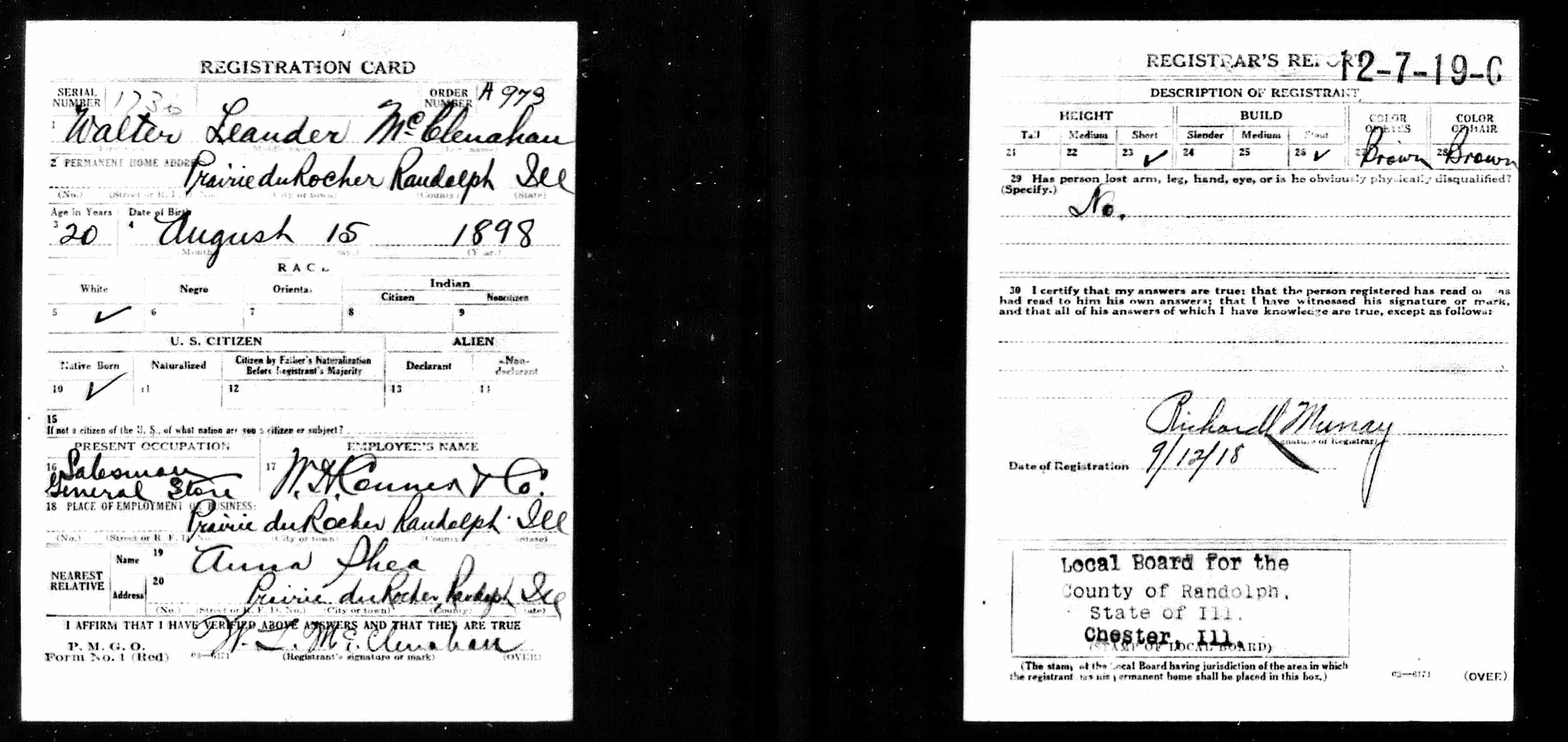 WWI Draft Registration, Walter Leander McClenahan