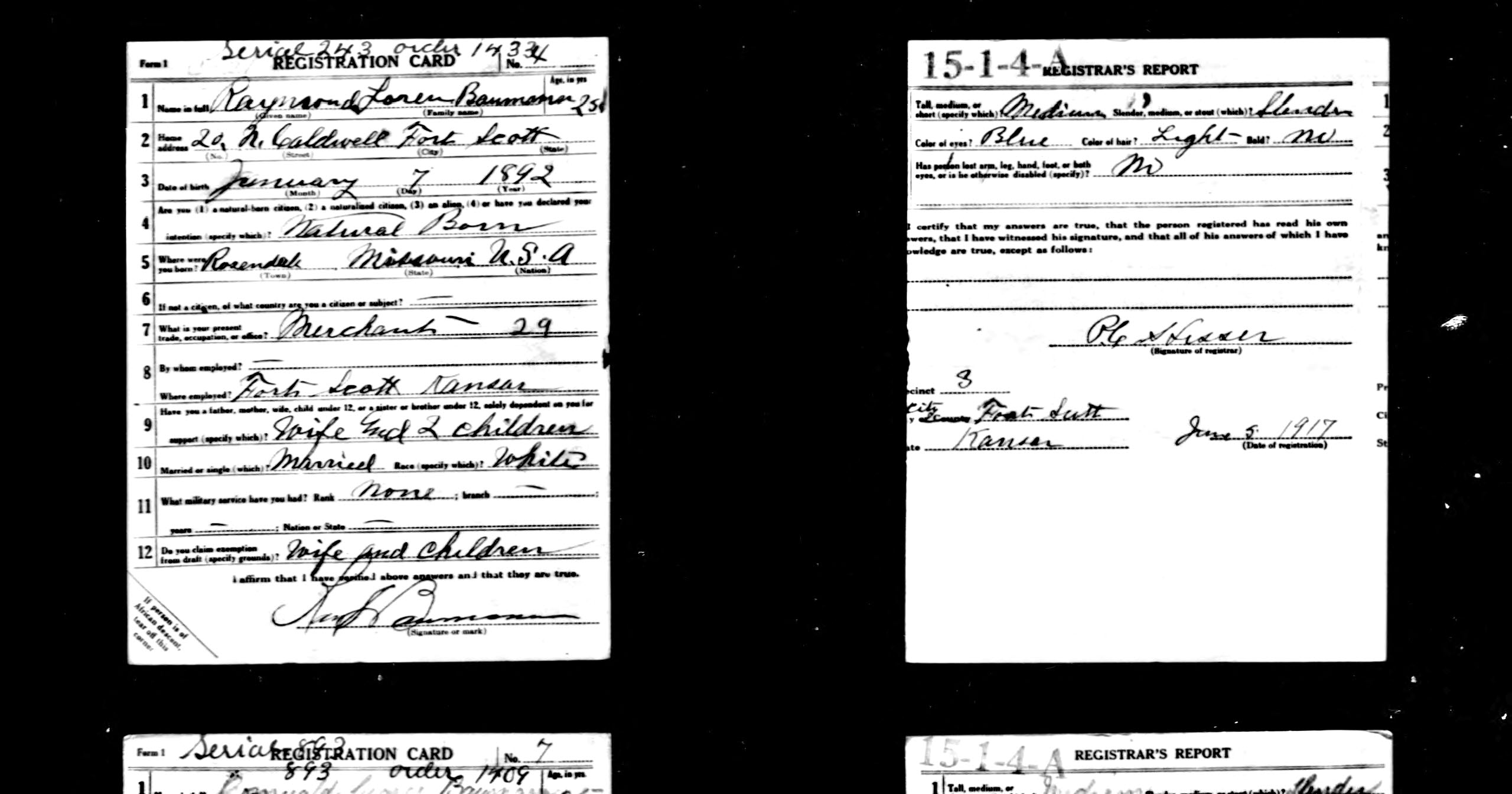 WWI Draft Registration, Raymond Loren Bauman
