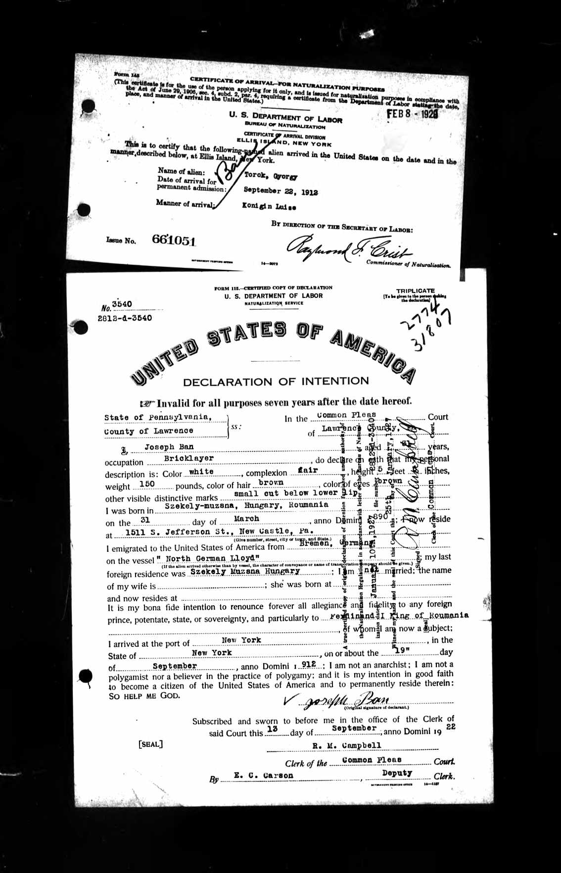 U.S. Naturalization Original Papers, Joseph Ban