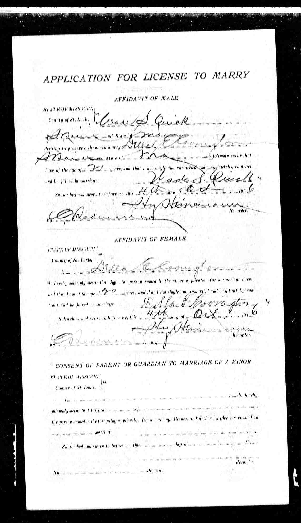 Missouri Marriage Application, Wade S. Quick and Della E. Covington