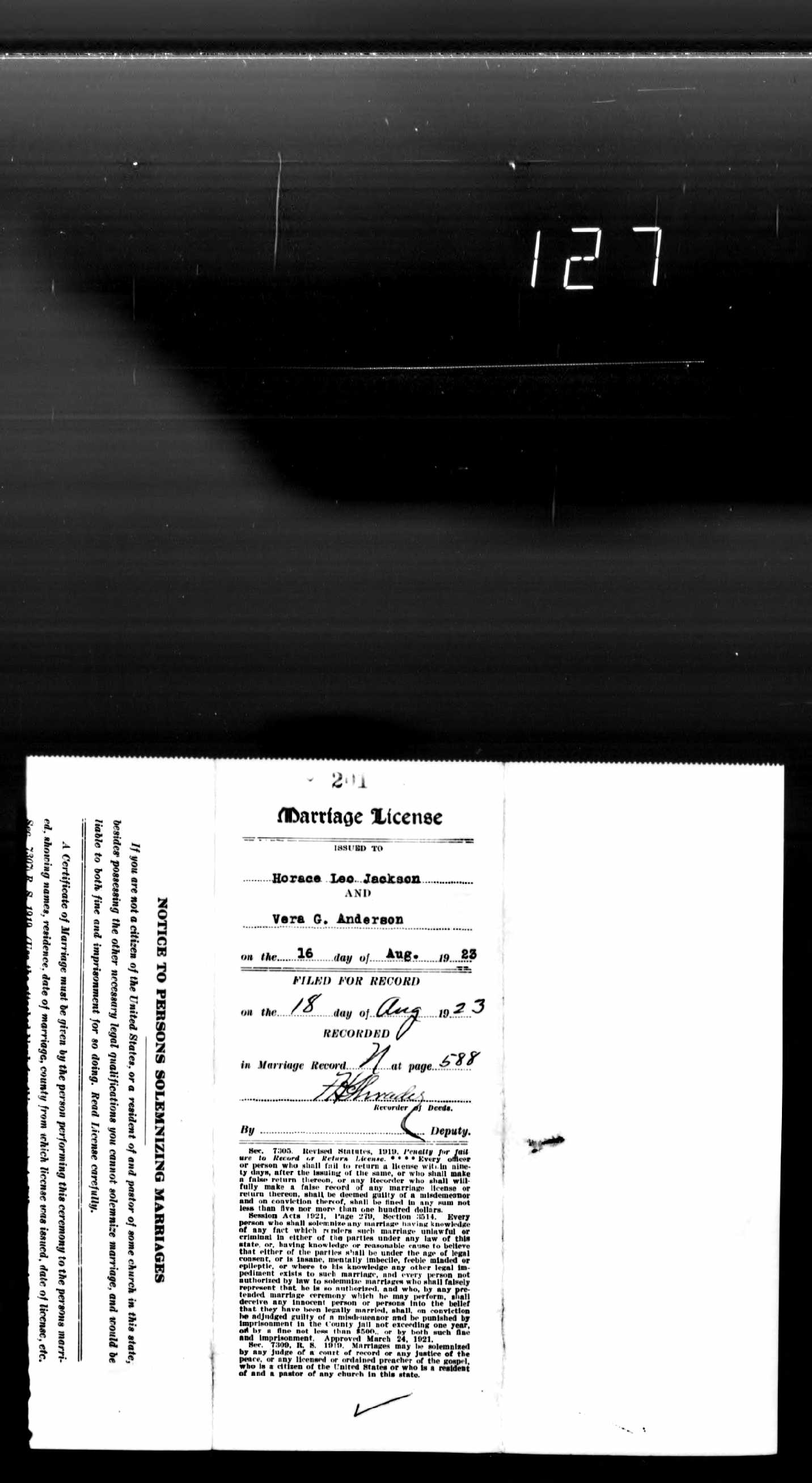 Missouri Marriage Record, Horace Leo Jackson and Vera G. Anderson