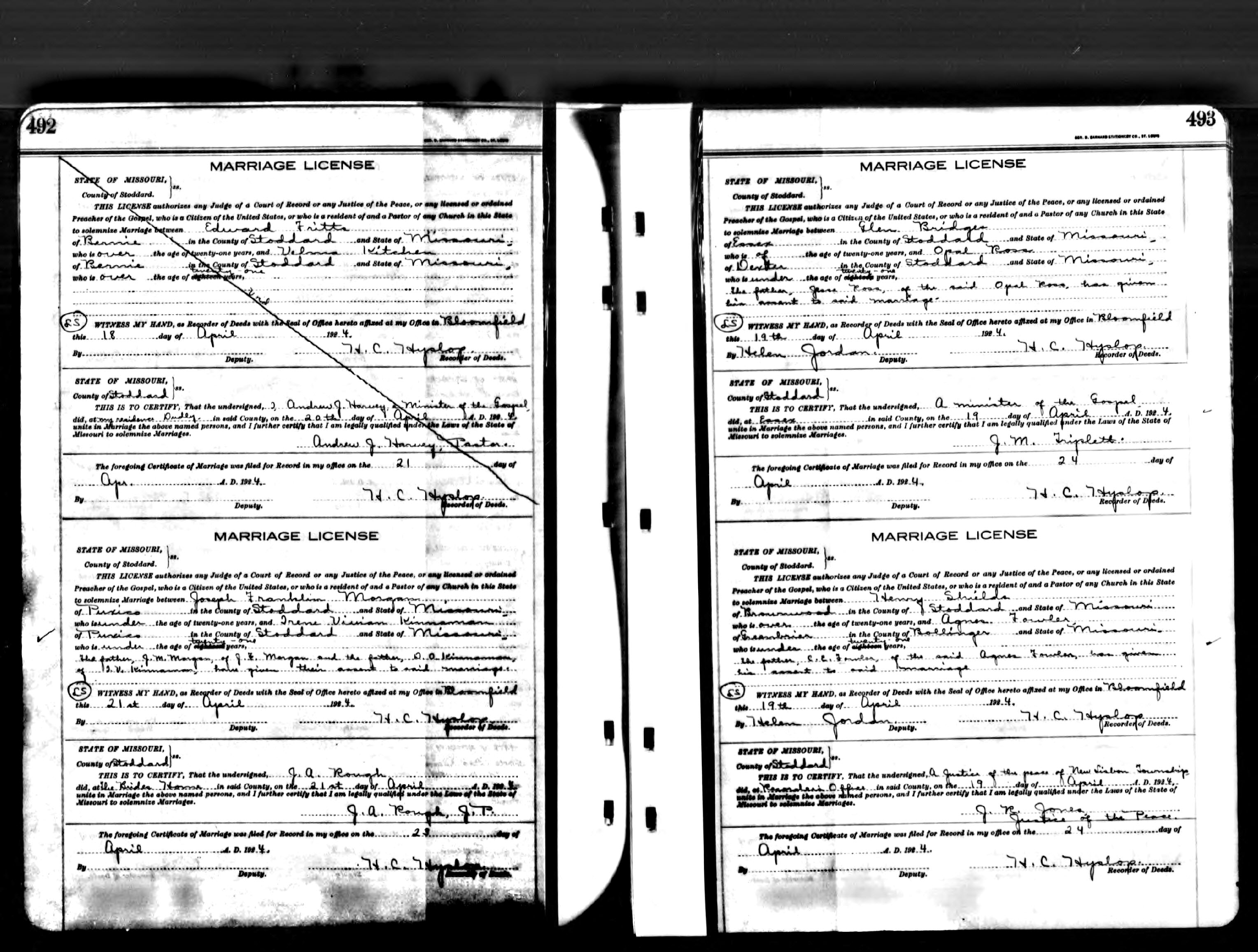 Missouri Marriage Record, Joseph Franklin Morgan and Irene Vinian Kinnaman