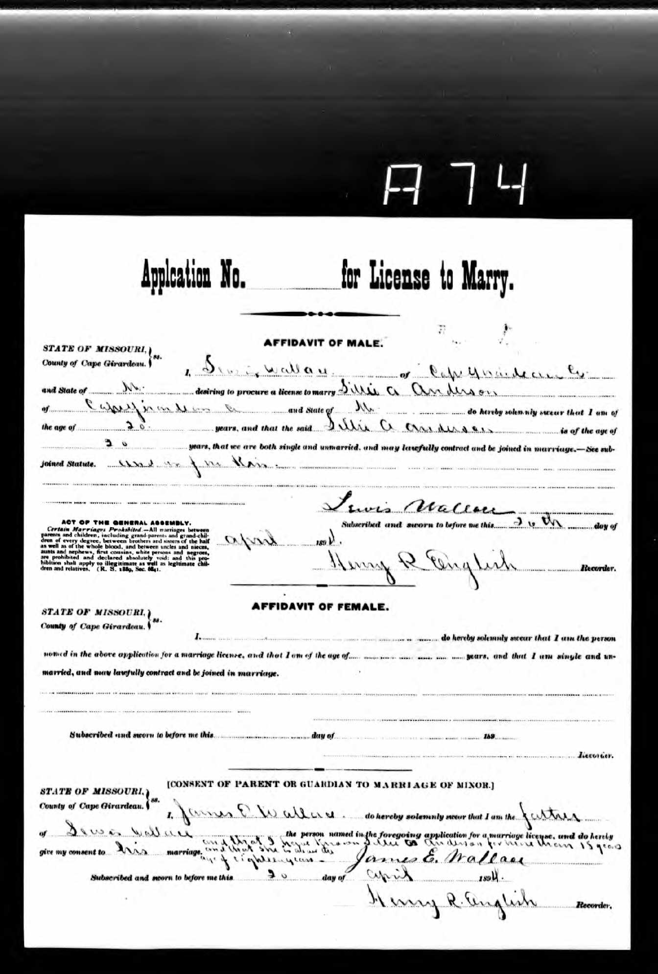 Missouri Marriage Application, Lewis Wallace and Lillie A. Anderson