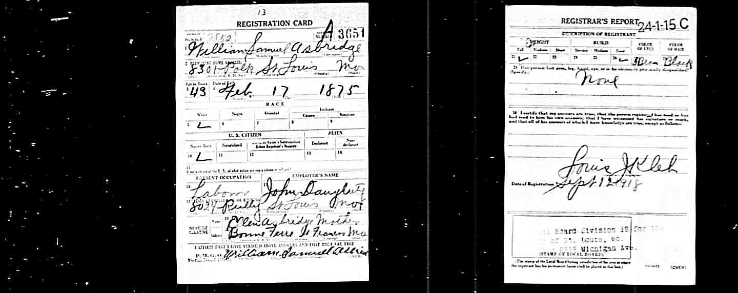 WWI Draft Registration, William Samuel Asbridge