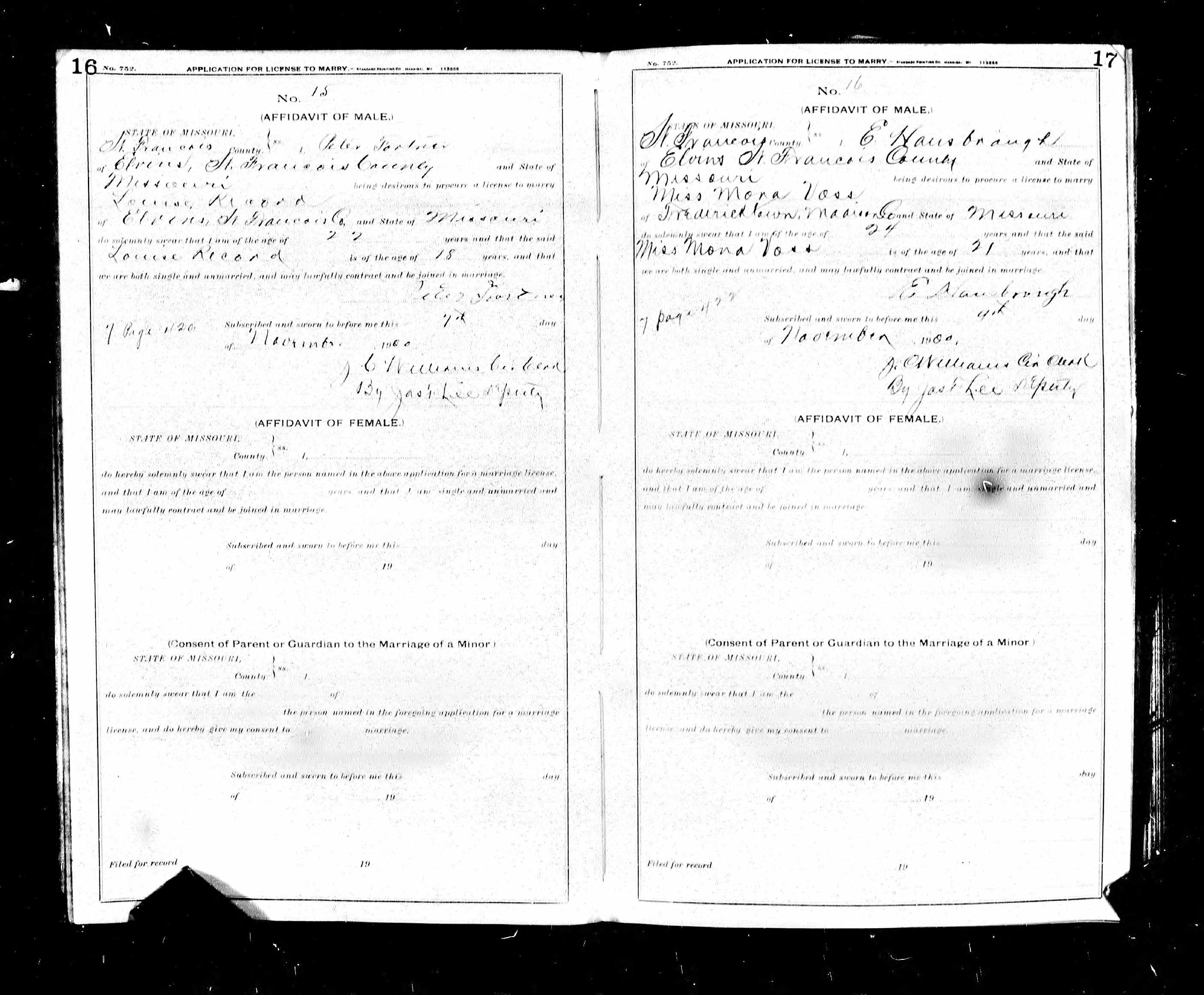 Missouri Marriage Application, E. Hansbrough and Mona Voss